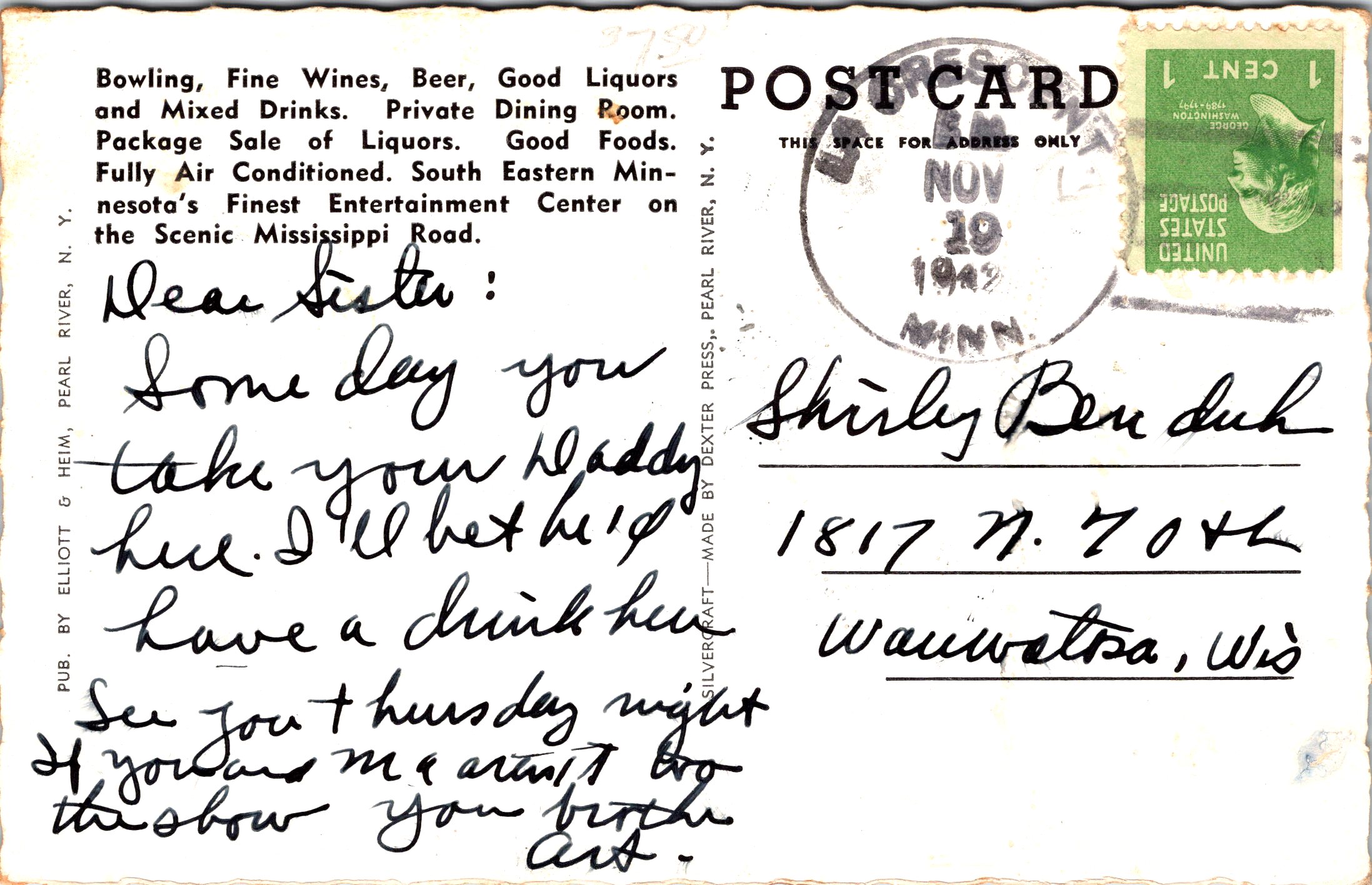 This vintage lithographic postcard features Carroll’s Liqour store located in La Crescent, Minnesota. The store’s design is Art Deco. At the time of this photo, the proprietor of this business was W. S. Carroll. Printing on the reverse of the postcard reveals that Carroll’s was more than a liquor store. Options available in the store were drinking at the bar, dining, and bowling. The advertising describes Carroll’s as an “entertainment center”. This card was published by Elliott & Heim. Their business was located in Pearl River, New York. The postmark reveals that this card was mailed in the 1940’s. SOLD