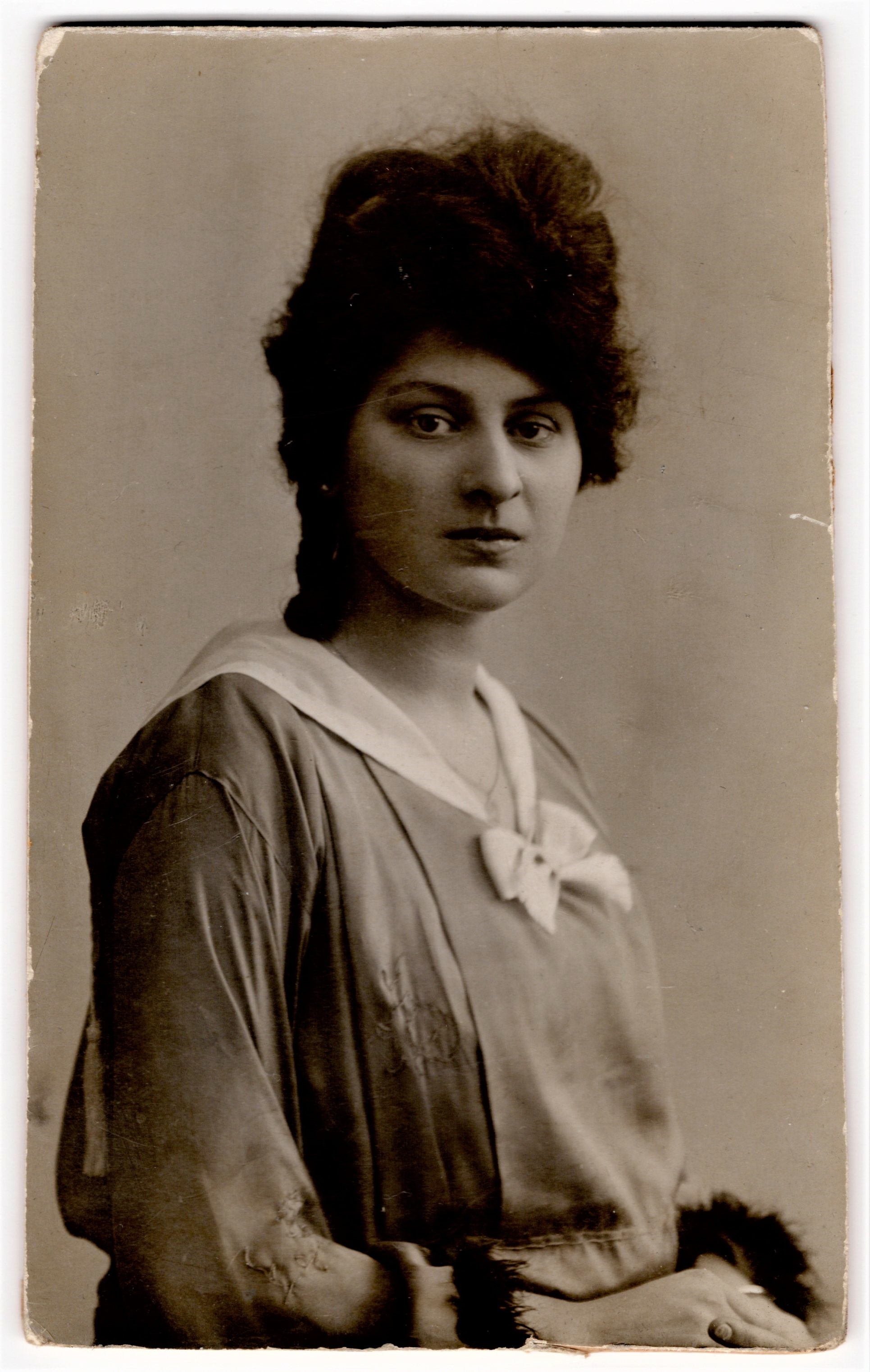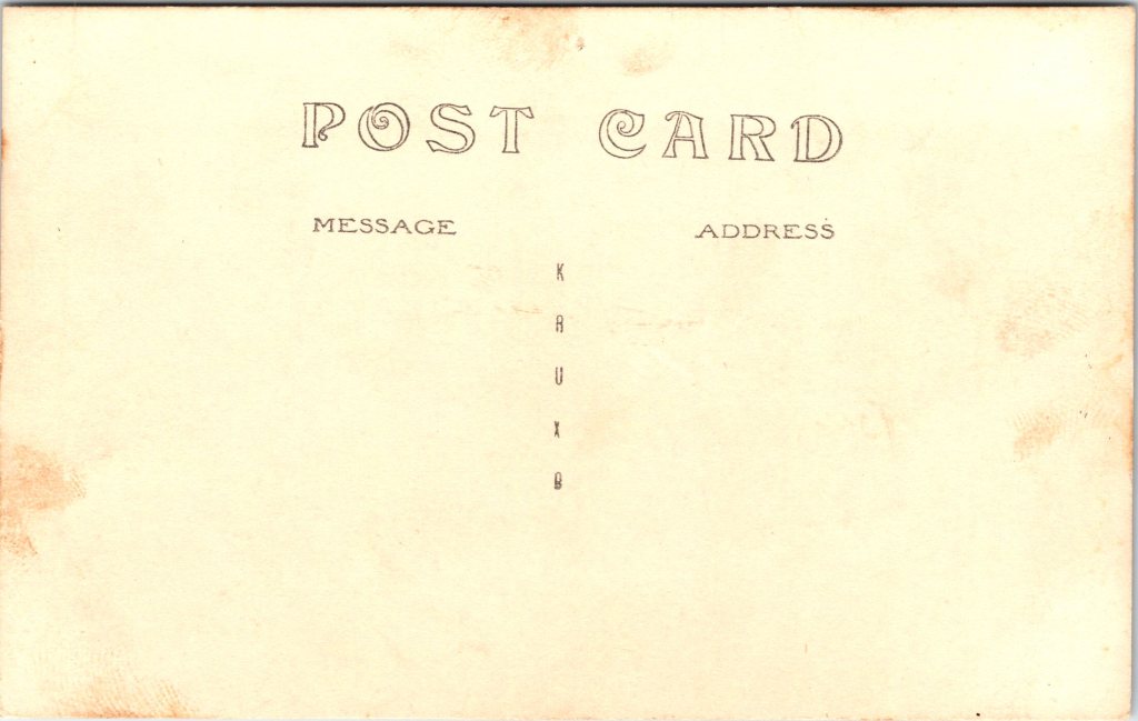 This vintage real photo postcard has a number of interesting features. The women are posed on a fabric covered bench. They are dressed in noteworthy attire. One is wearing a nautical type outfit while the other is dressed in a kimono styled pant suit, or possibly pajamas. I wish I knew the story of these two women. What was the nature of their relationship? Sisters? Lovers? Due to the passage of time, the story has to be whatever we imagine it to be. This photograph was taken by the Foto Rembrandt studio in Bucharest, Romania. Viewing the photographers ink stamp on the reverse of the postcard, leads me to believe that the photographer was A. Maza. The stamp box indicates that the postcard was published by K Ltd sometime between 1918 and 1936. At least one postcard collector has posited that K Ltd may actually be the maker of the paper that the postcard is printed on. SOLD
