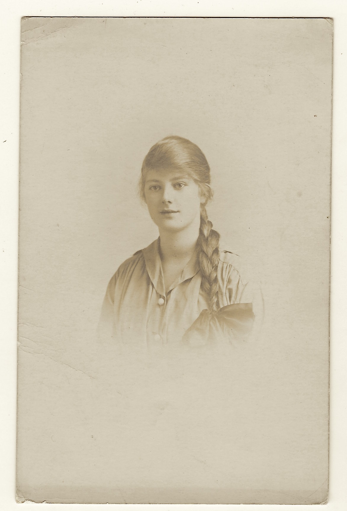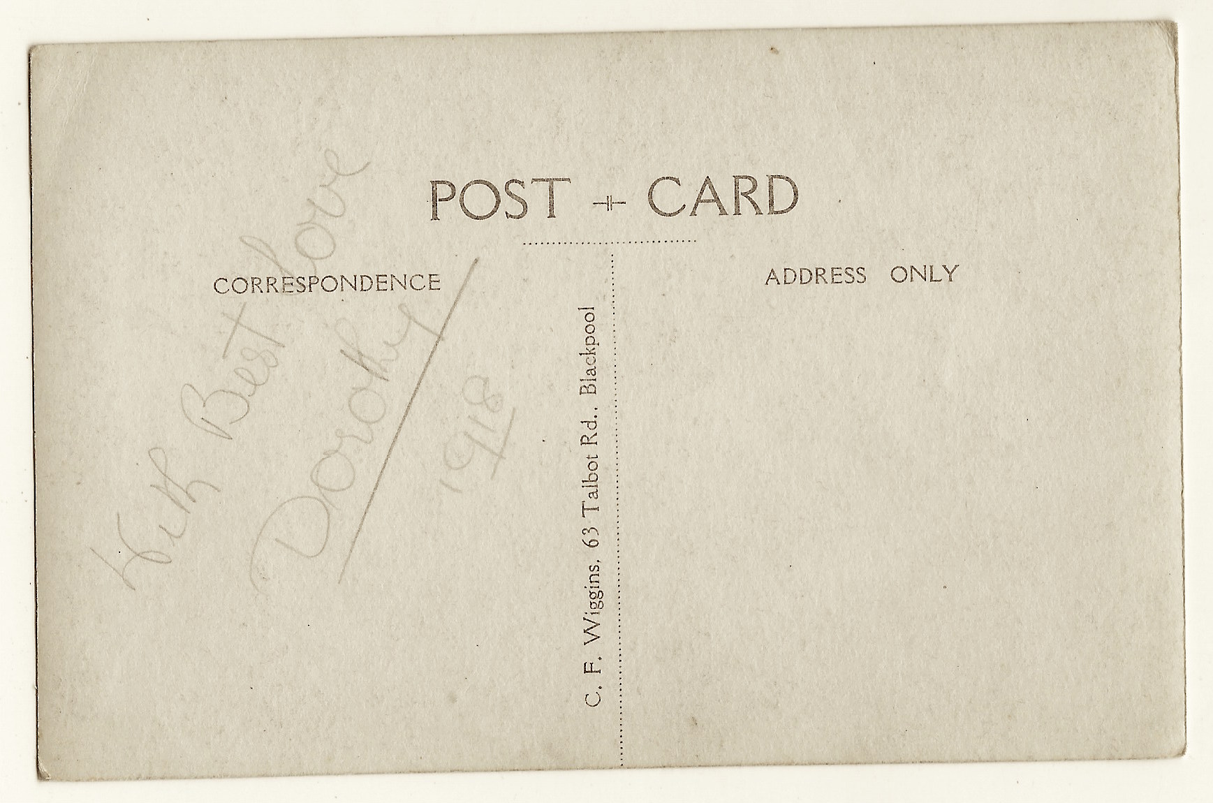 This vintage real photo postcard features a pretty young woman named Dorothy. She appears to be in her teenage years. Note her braided hair which is tied with a large bow. Dorothy wrote a message on the reverse of this postcard. She declares that she sends the postcard “With Best Love” and she indicates that the postcard was written in 1918. The photographer of this photograph is C. F. Wiggins and his studio was located in Blackpool, England. This lovely postcard is more than one hundred years old. (SOLD)