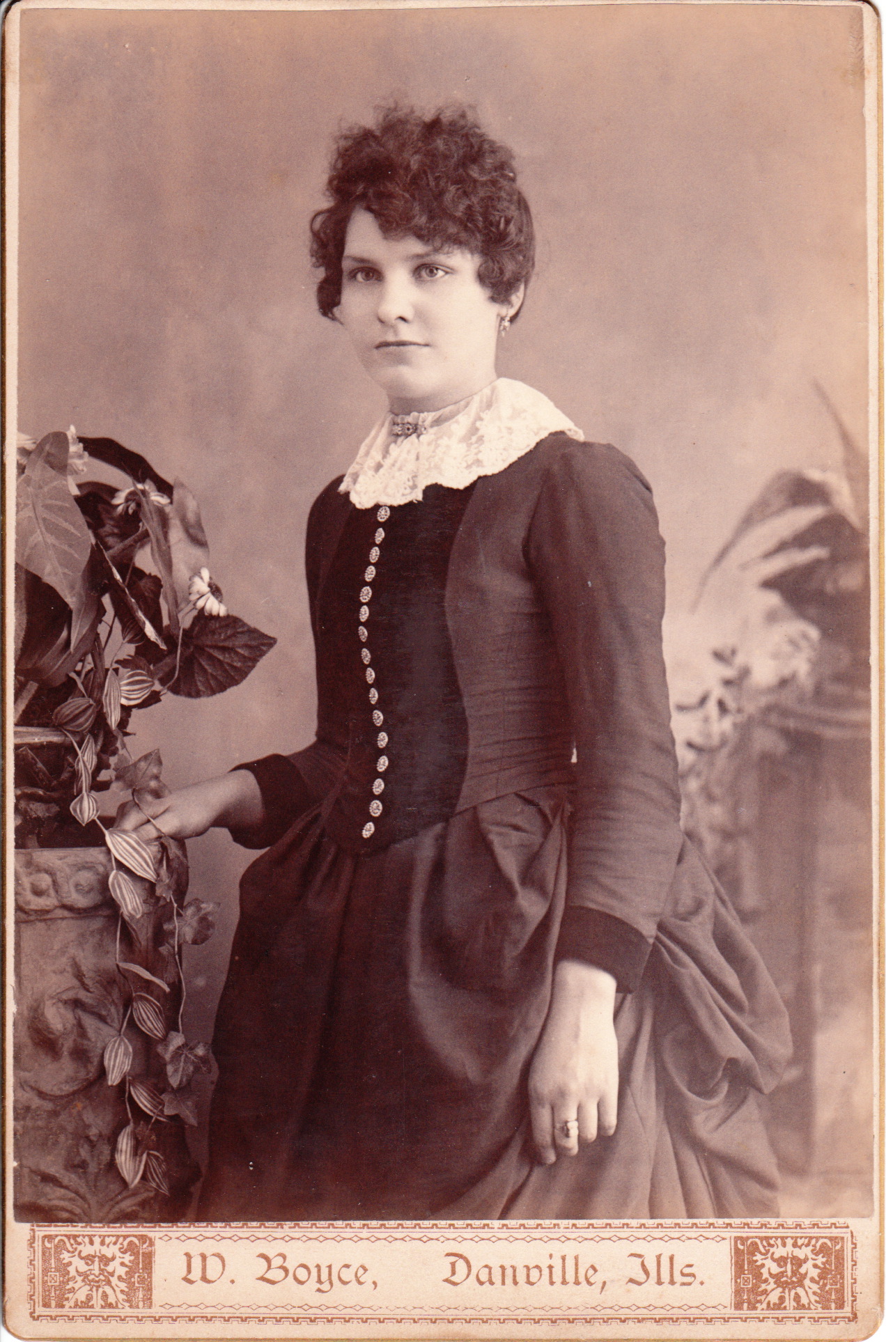 A pretty young woman poses next to an indoor plant in the studio of Washington Boyce, in Danville, Illinois. The woman is wearing her hair up, and has a ring, collar pin, and earrings. Washington Boyce is mentioned in an Illinois law journal (1894) concerning a breach of contract case involving a violation of a non compete clause in the sale of a photographic studio. He is also referenced in a photographic journal (1886) for holding a patent on an innovative photographic paper box. Boyce’s studio was located at 18 North Vermillion Street, in Danville. SOLD