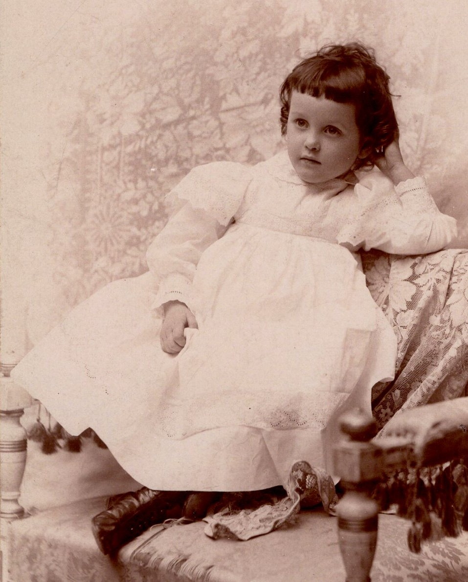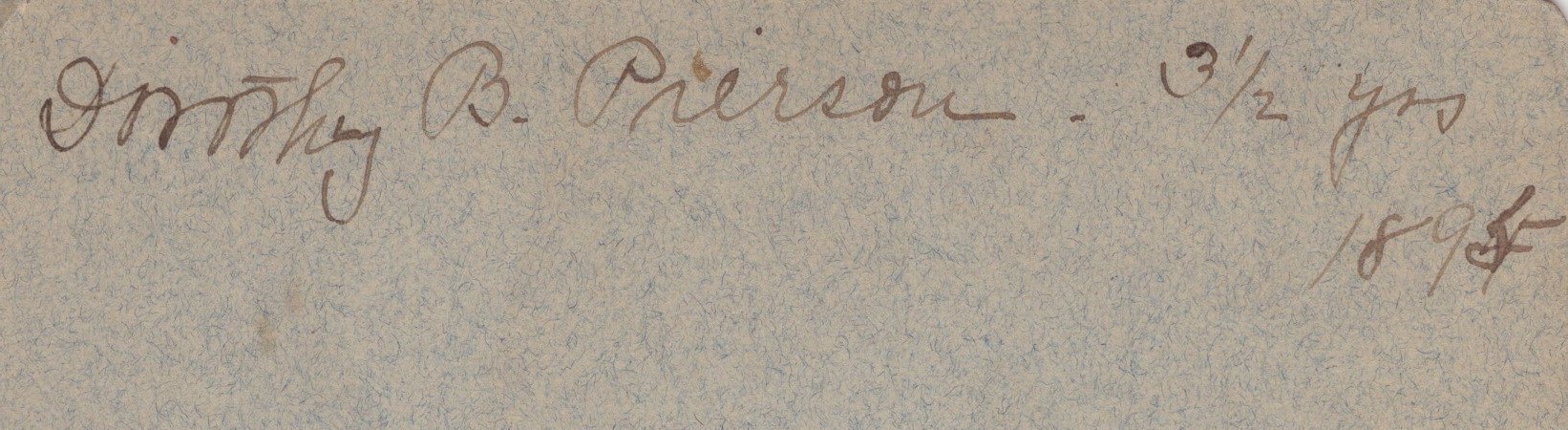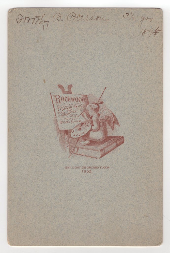 This cabinet card portrait features an adorable little girl wearing a longish gown and sitting on a large chair. The child is identified by an inscription on the reverse of the photograph. Her name is Dorothy B. Pierson and she was 3 1/2 years old when she sat for this photograph. The photo was taken in 1895 by a very well known photographer who took many celebrity portraits. The child was photographed by George Rockwood (1882-191) whose studio was located in New York City. Rockwood was born in Troy, New York and graduated from college with a PhD, reportedly either from the University of Chicago, or Columbia University. At 21 years of age, he was a newspaper reporter for the Troy Daily Times and at age 23, he was managing editor of the Troy Daily Post. He began working as a photographer in St. Louis and in 1857 opened a studio with his brother Elihu in New York City. He has been credited with bringing CDV’s to America. His obituary in the Washington Post reports that Rockwood photographed more than 350,000 people. This cabinet card portrait has corner wear at it’s top right corner and is in overall good condition (see scans).