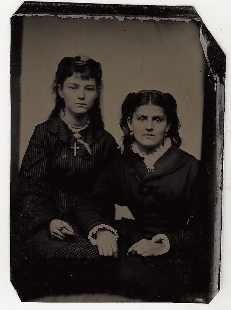 This tintype portrait features what appears to be a mother and daughter. Both women are pretty and both share an intense expression as was often the style of the tintype era. Mom has frilly lace on her collar and sleeve cuffs. The daughter is in a striped dress and is wearing a prominent cross. Tintype photography was most popular during the 1860’s and 1870’s. SOLD