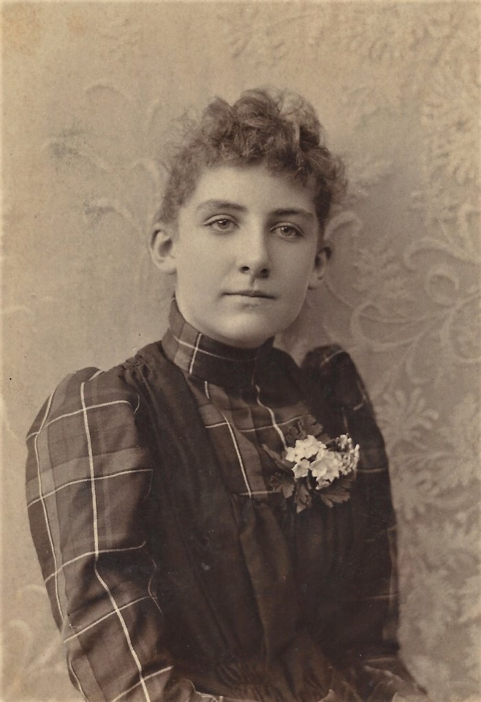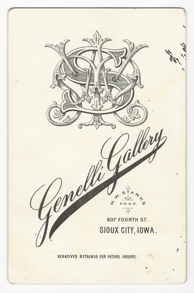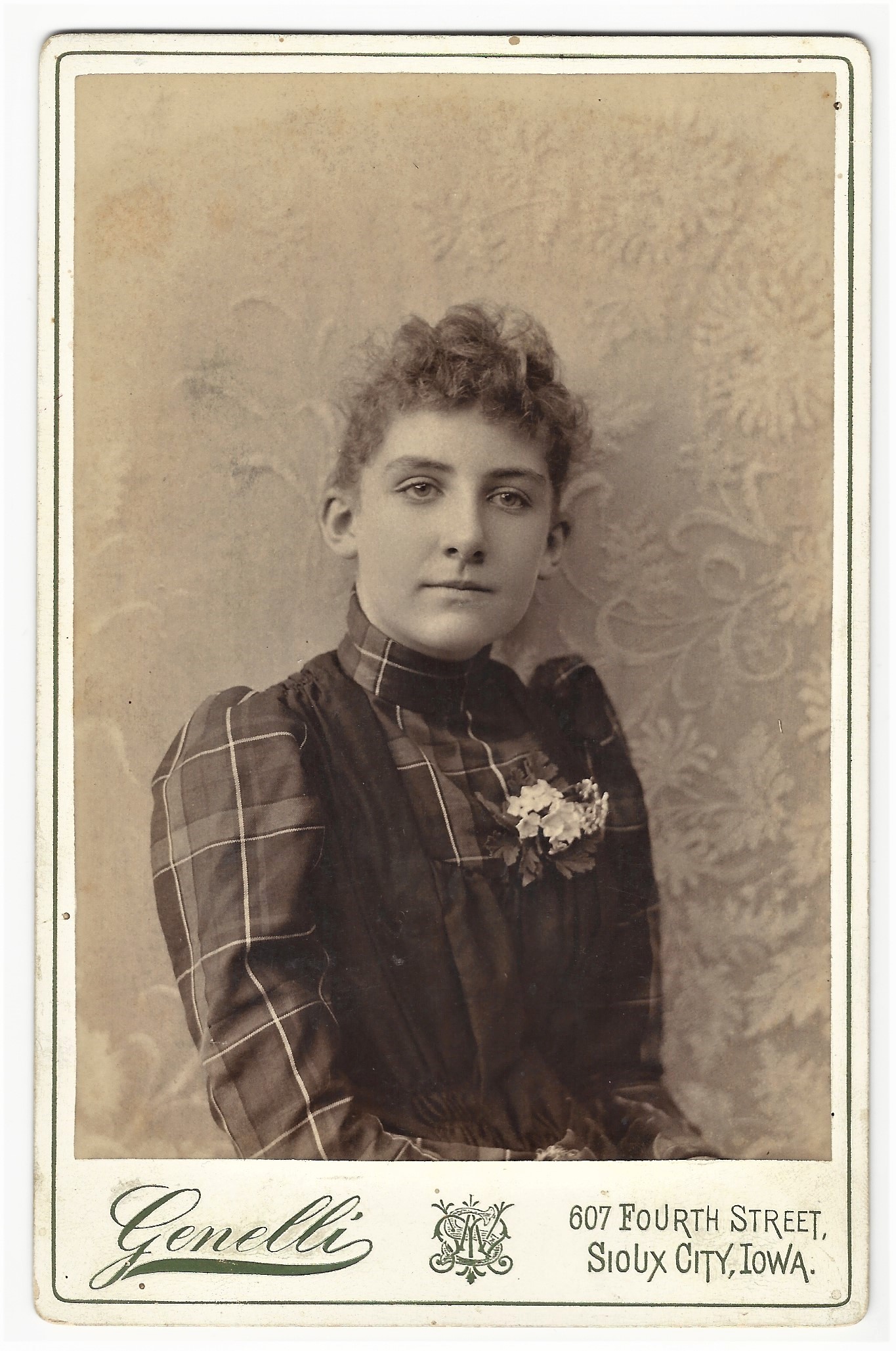 A pretty young woman appears in this portrait photograph from the Genelli studio in Sioux City, Iowa. She is wearing a lovely plaid dress with a corsage. The reverse of the cabinet card indicates that the proprietor of the studio was M. W. Starks. The book, History of the Counties of Woodbury and Plymouth Iowa (1890), reveals that M. W. Starks was born in Bradford, Illinois in 1851. In 1872 he began apprenticing as a photographer and soon entered a career in this field. In 1883 he came from St Louis, Missouri to Sioux City and established the Genelli gallery. In 1884 he married Miss Hattie L. Harvey. SOLD