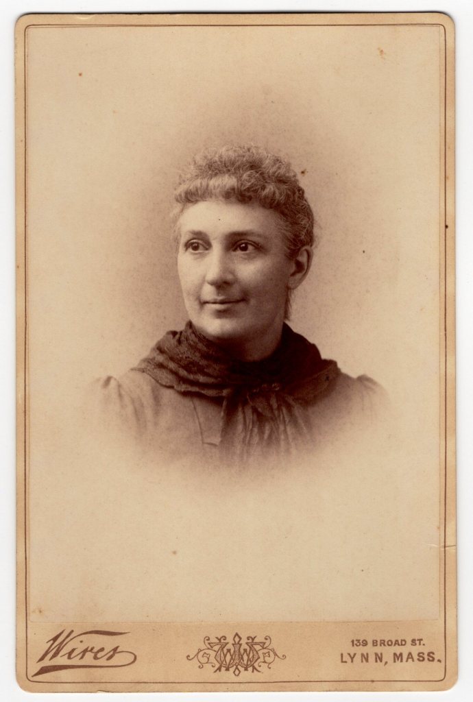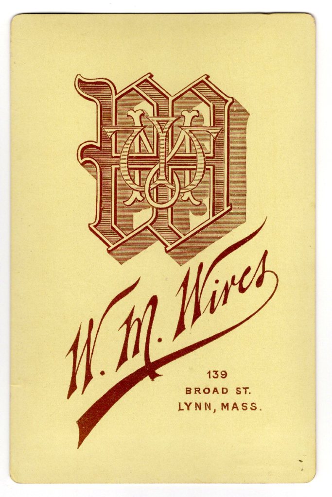 This cabinet card features a young woman posing for her portrait at the studio of William Marshall Wires, in Lynn, Massachusetts. Wires was born in Cambridge, Vermont in 1842. He was a veteran of the American Civil War (originally in Fifth Regiment of Vermont Volunteers). He became a member of the Signal Corps and participated at the battle of Gettysburg. He moved to Lynn in 1872. He was a prominate photographer there from 1873 to at least 1913. He died at the Soldier’s Home in Chelsea, Massachusetts in 1920. He was an active member of the Grand Army of the Republic. SOLD