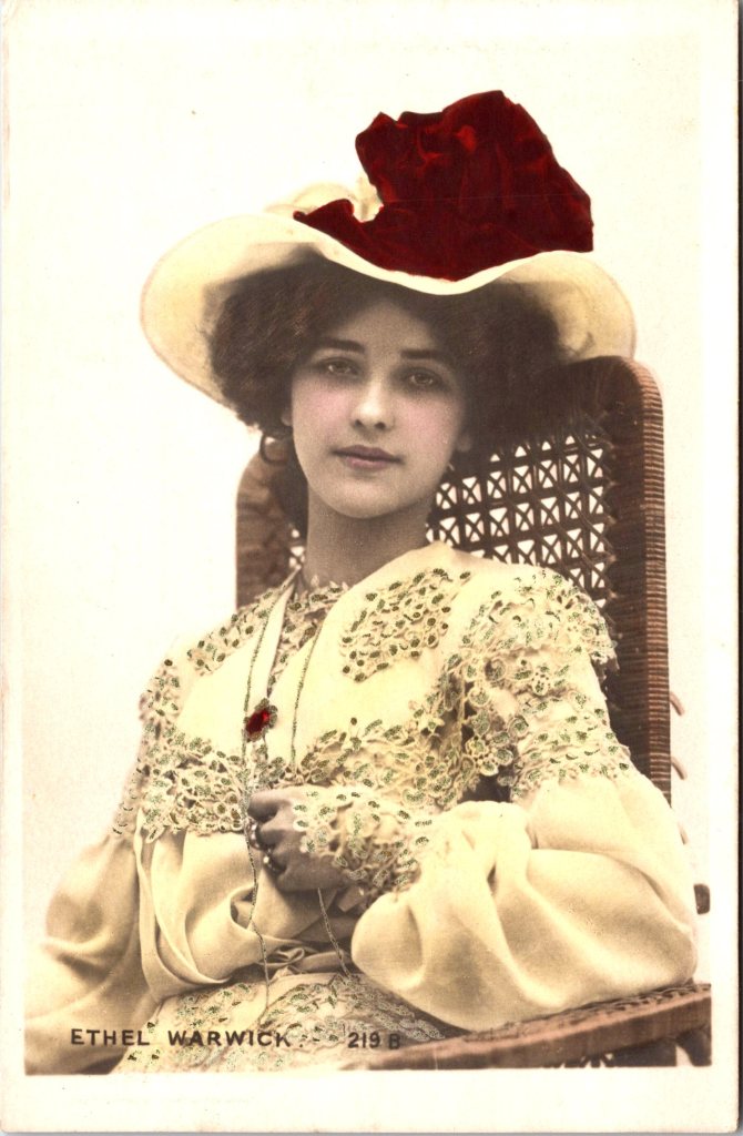 Postcard 1 is a vintage real photo postcard that features beautiful British stage and film actress, Ethel Warwick (1882-1951). Warwick was also an artist’s model (including posing nude). She modelled for some of the most prominent artists of her time. These artists included John William Godward, Herbert Draper, Linley Sambourne,and James McNeill Whistler. During the early 1890’s, Warwick was studying to be an artist at the London Polytechnic. In order to pay for her tuition, she became an artist model. In the late 1890’s, Warwick began acting school and in 1900 she made her acting debut. She continued her modeling until 1906, when she married actor Edmond Lewis Waller. Edmond was the son of celebrated actor, Lewis Waller. Edmond and Ethel embarked on a theatrical world tour ending in London, where the pair took over the management of the Queen’s theater. Warwick divorced Waller in 1915. Post divorce, she lived an extravagant lifestyle which led to bankruptcy in 1923. Ethel continued to act and much of her work was for the New Shakespeare Theater at Stratford-upon-Avon. (SOLD)