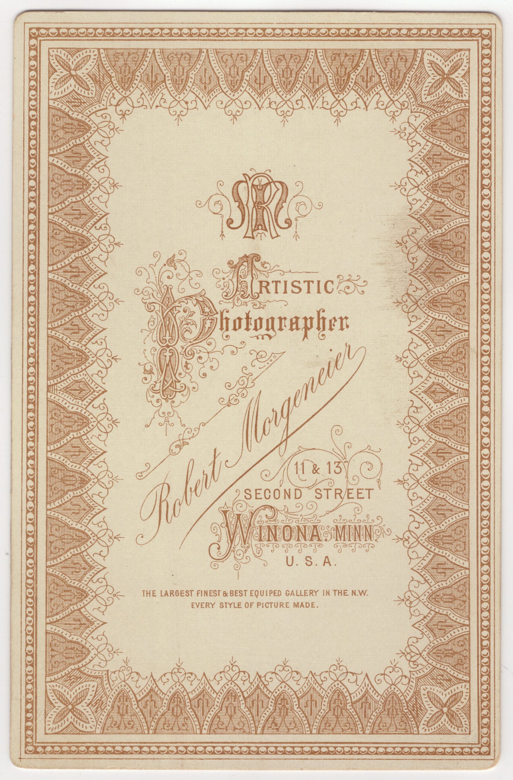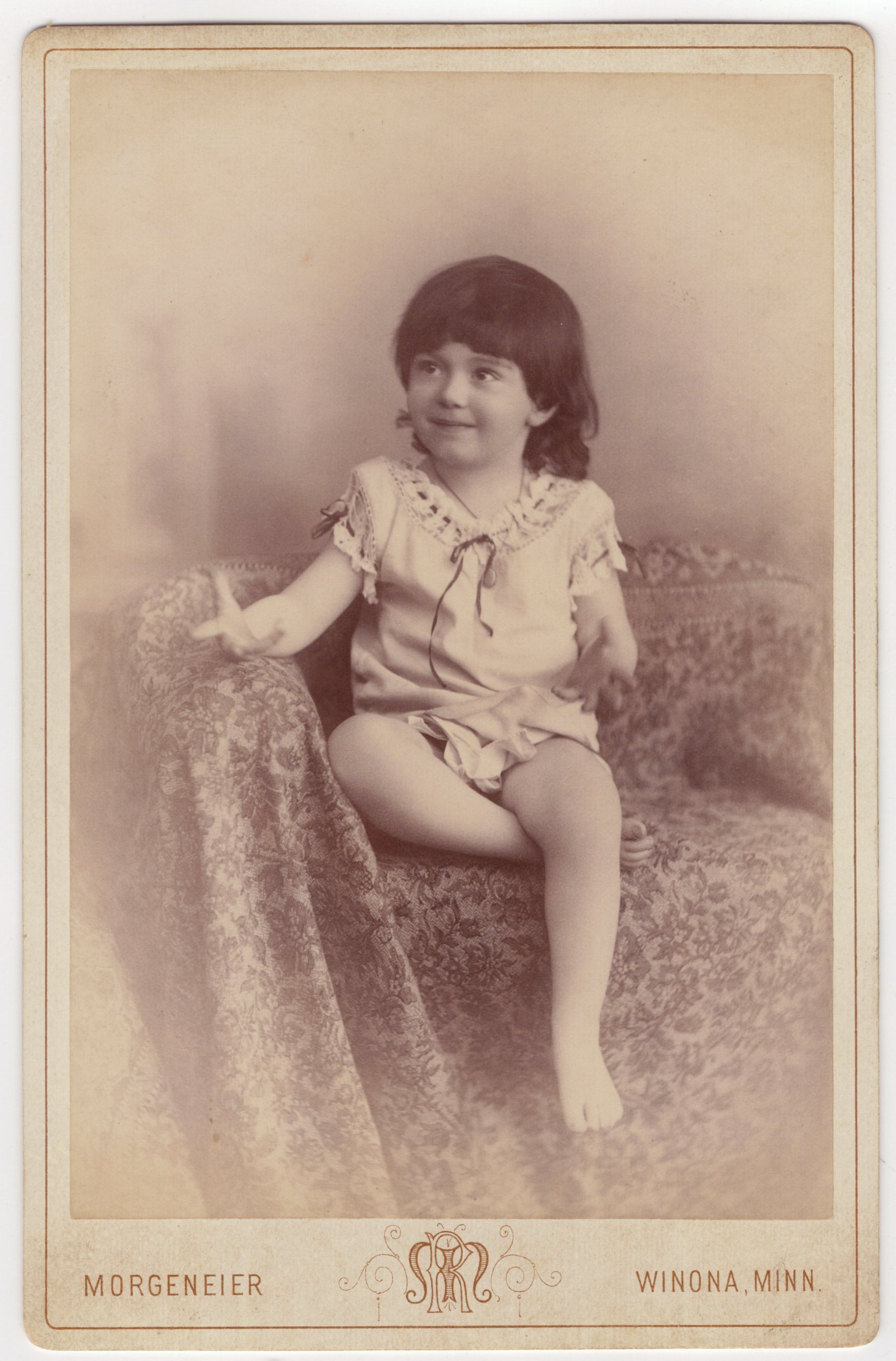 This cabinet card features an adorable little girl displaying an impish expression. She has great eyes and a great smile. The child is definitely not shy in front of the camera. This photograph was taken at the Morgeneier studio in Winona, Minnesota. Robert Morgeneier had his own studio at the time that he shot this photograph. At other times in his career he had partnerships. He worked in Winona in the 1880’s and 1890’s. This photograph was taken from a studio he operated in 1883 and 1884. This cabinet card is in very good condition (see scans).