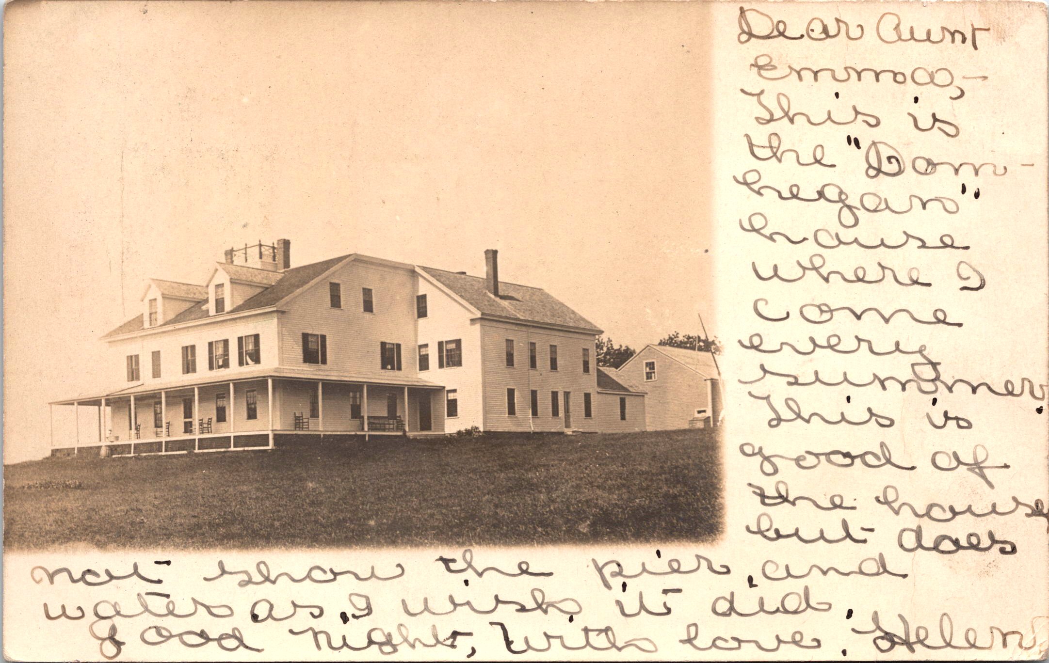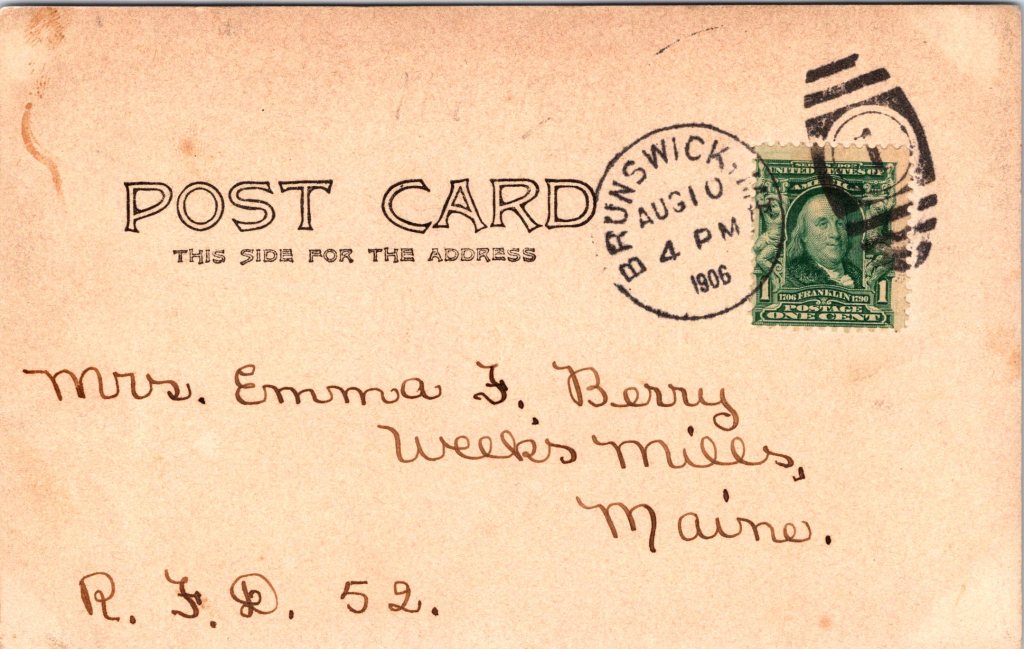 This vintage real photo postcard features a photograph of Domhegan, Joshua Lawrence Chamberlain’s (1828-1914) summer home. Domhegan was located at Simpson’s Point, in Brunswick, Maine. The house was on Casco Bay and Chamberlain enjoyed sailing in the area. He paid one thousand dollars for the property which at the time was a shipyard. He used Domhegan as his summer house and as an artist colony. Chamberlain buried his war horse “Charlemagne” on the Domhegan property. He gave the horse a Christian funeral. Chamberlain was a college professor at Bowdoin college in Maine when the civil war broke out. He joined the Union Army and became a highly respected and decorated military officer. He was one of the major heroes of the battle of Gettysburg, when he led a desperate and surprise bayonet attack against Confederate forces. Chamberlain won the Medal of Honor for his bravery and leadership actions. He left the Army as a Brigadier General. After the war he served four terms as the Governor of Maine and then returned to Bowdoin College to serve as it’s President. He died in 1914 as a result of complications from one of his civil war wounds. Unfortunately, in 1940 Domhegan burned down to the ground. Helen, the writer of this postcard, tells her Aunt Emma, that she stays at Domhegan every summer. She praises the photograph of the house but points out that the property’s pier and water are not visible in the photo. This undivided back postcard was postmarked in 1906. Chamberlain was still alive during Helen’s visits. One wonders if she and her family had some familial or social connection to Chamberlain. SOLD