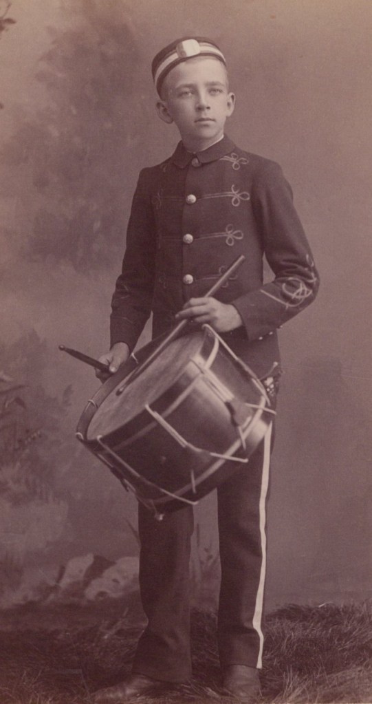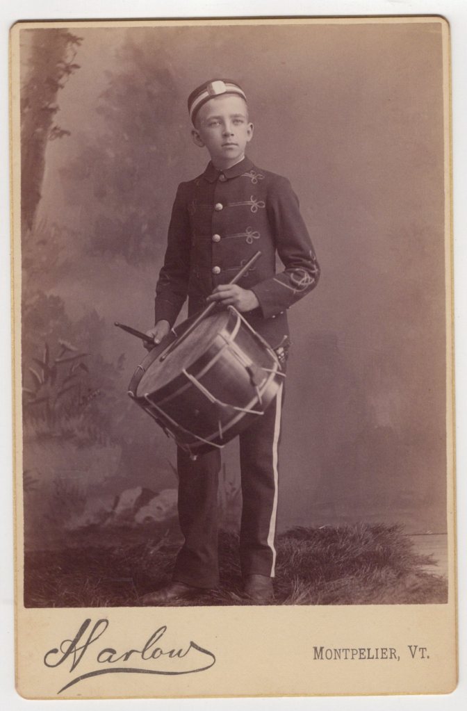 A young drummer poses for his photograph at the studio of Harlow in Montpelier, Vermont. The serious looking boy is likely proud to be wearing his band uniform. The reverse of the card has an inscription identifying the lad as Walter Huntley. SOLD