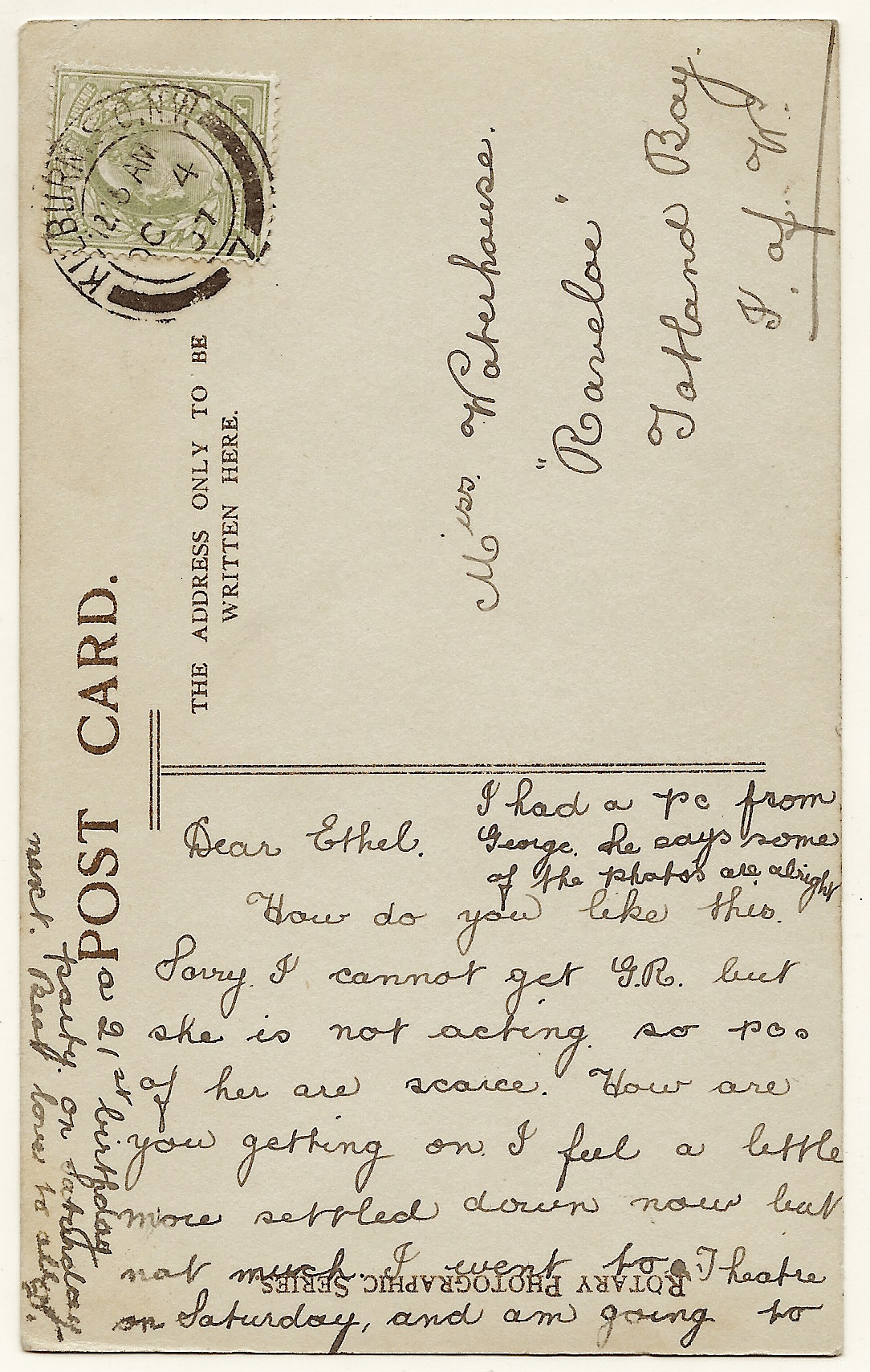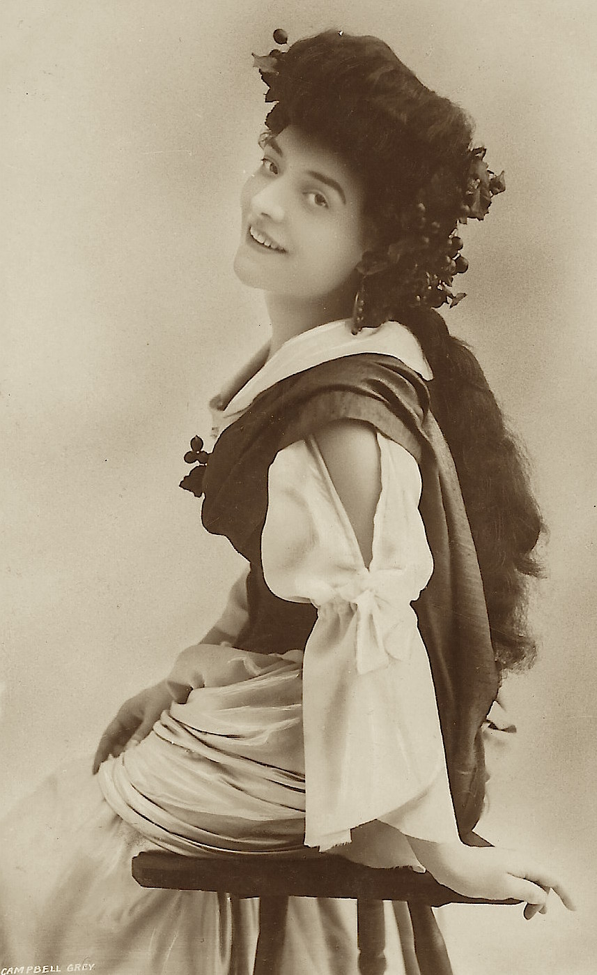 The adorable stage actress featured in this vintage photo postcard is Madge Temple (1875/80-1943). She was an English actress, vocalist, and music hall comedienne. Temple’s first appearance in pantomime was at West London’s, Lyric Theatre, at Christmas in 1900. She then went on tour and in 1905, she began playing on the variety stage. She then successfully toured music hall theatres with such songs as “Come , Be My Rainbow”, “He’s a Very Old Friend of Mine”, and “I’m Looking for Mr. Wright”. In 1909 and 1910 she made a series of of recordings for Pathe. She was a popular performer on the British stage and became a star in Australia when she toured there in 1913-1914. Madge Temple was married to Herman Darewski (1883-1947), a successful composer of many popular songs. The pair had at least one child. The story of Neville Lawrence Darewski is told in a book entitled “SAS Italian Job: The Secret Mission to Storm a Forbidden Nazi Fortress”. He was known as “Major Temple”, adopting his mother’s last name as his nom de guerre. He was a member of a an elite “Special Duty” unit and was involved in secret missions during World War II. He was a member of Churchill’s “Ministry for Ungentlemanly Warfare”. In 1943 he was dropped behind enemy lines in Italy. He commanded a unit of five hundred Italian partisans. The group did a great deal of damage to the Italian and German military in Italy. They attacked a airbase and destroyed eighty-nine Italian planes. Unfortunately, Major Temple did not survive the war. He was killed in a truck accident as he was trying to escape the German army which after much time and effort, had surrounded his unit. This postcard is postmarked 1907 in Kilburn which is likely the Kilburn that is a section of London. The photographer of this portrait of Madge Temple is Ian Douglas Campbell-Gray. He is associated with ten portraits in the United Kingdom’s National Portrait Gallery. The British Journal of Photography (1910) printed a photograph of a commercial truck that advertised Campbell Gray’s photo studio. His creative flair is evident because the back half of the truck looked exactly like a camera. This postcard has a message which discusses the photograph on it’s front. The writer apologizes about her inability to find a photo card of “G.R.?” and claims that such cards are scarce because the performer was not active when the postcard was written. Could she be referring to “Gaynor Rowland”? This specific Madge Temple photo postcard is uncommon. The postcard is in very good condition (see scans). SOLD