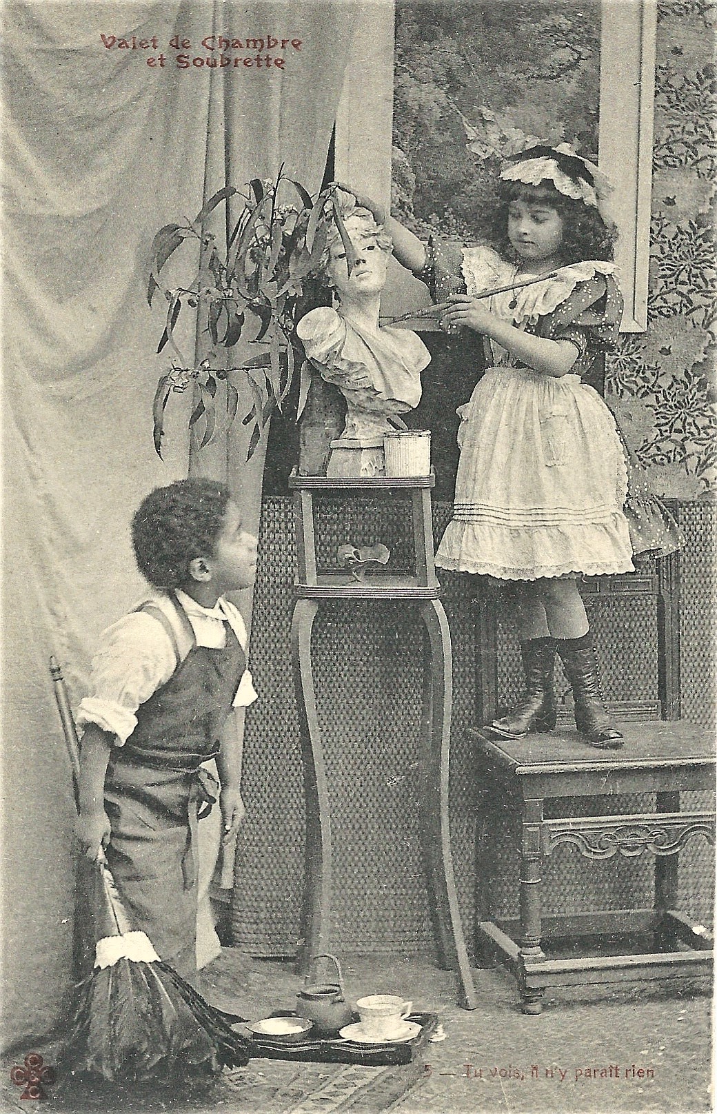 This vintage real photo postcard features a young black boy wearing coveralls and a young girl dressed in a maid’s uniform. The boy is holding a feather duster and looking at the girl who standing on a table and is in deep concentration as she brushes off a sculpture. This photographer produced this image in a tongue and cheek manner. A caption on this postcard states “Valet de Chambre et Soubrette” (valet and maid). SOLD