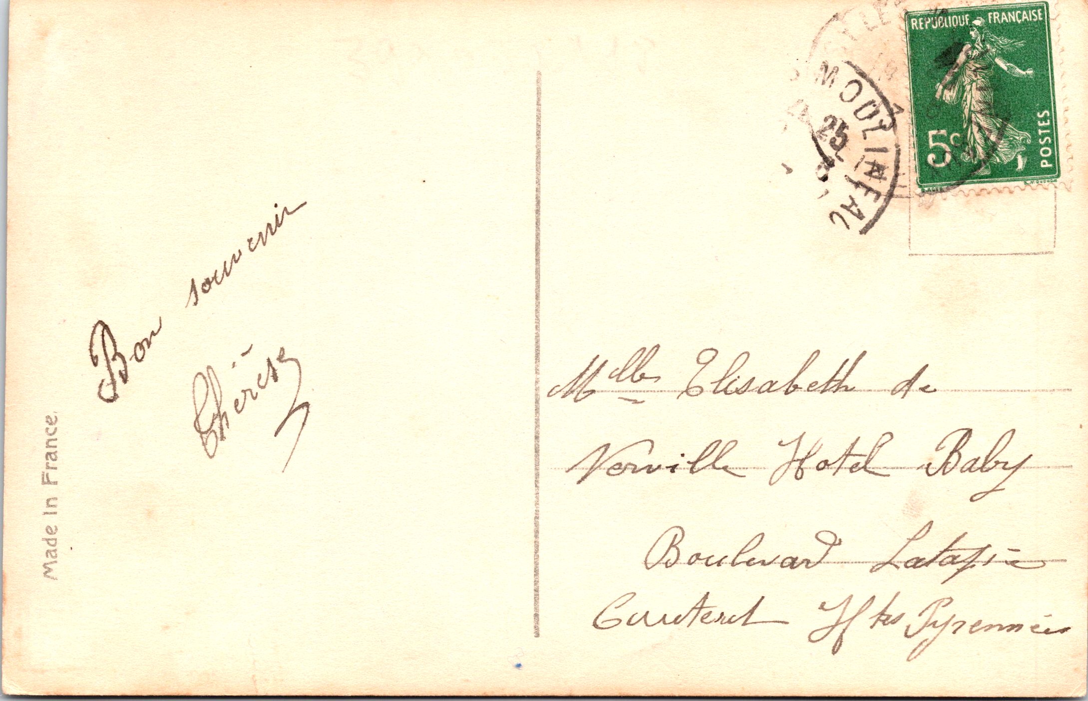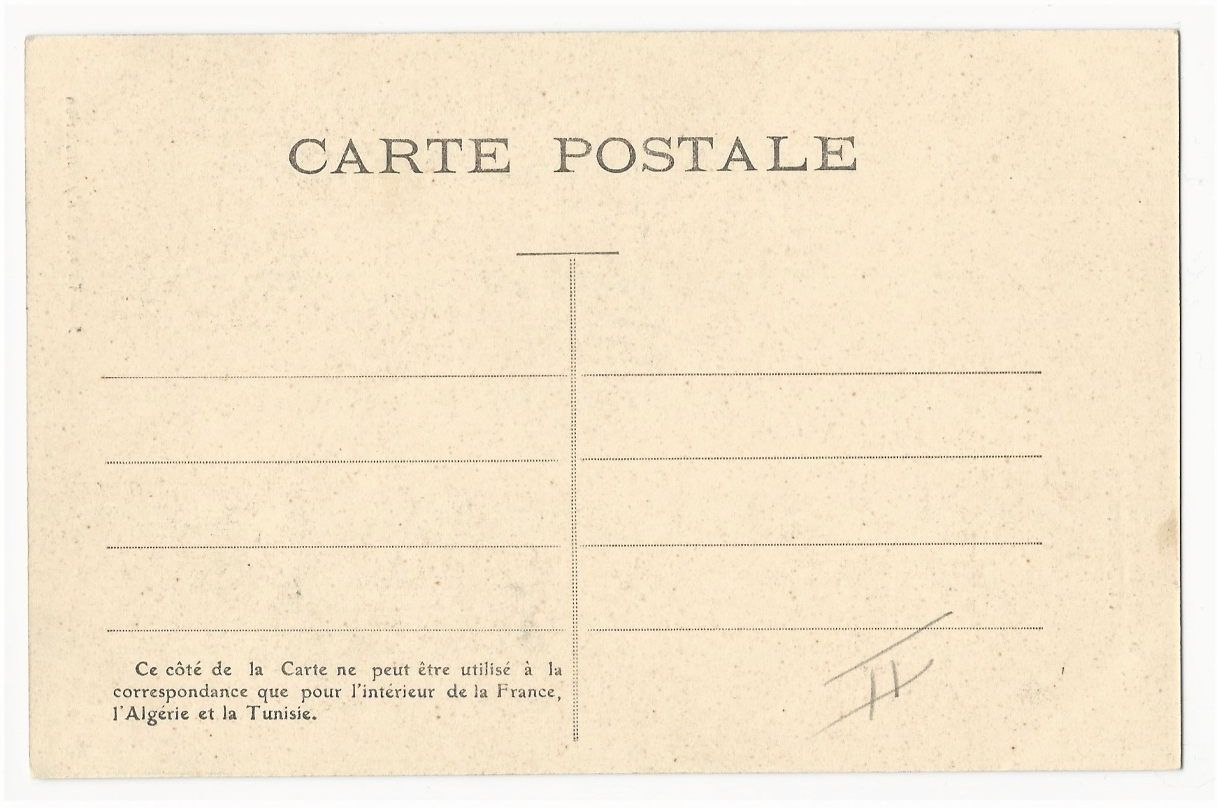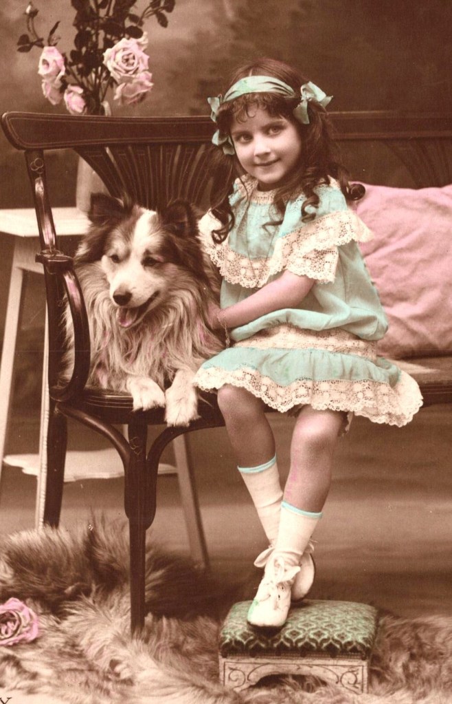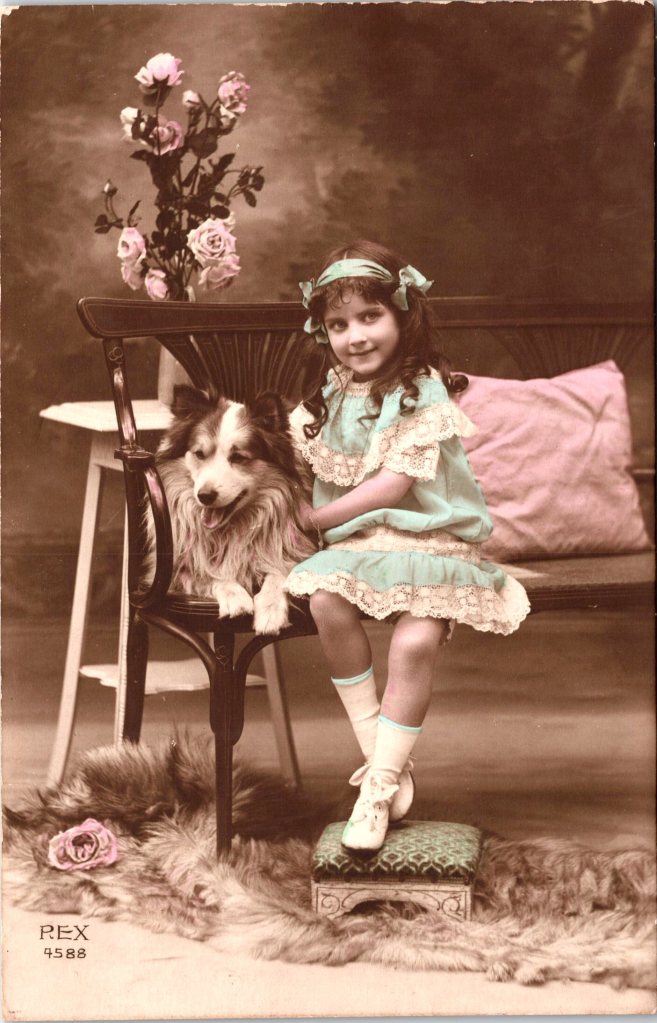 This French hand tinted real photo postcard features an adorable little girl sitting on a bench next to her dog. The dog appears to be a collie or a mixed collie breed. The postcard was published by Rex as part of a series (no.9588). Rex are the initials for “Societe Anonyme des Papeteries de Levallois”, a firm located in Paris, France. SOLD