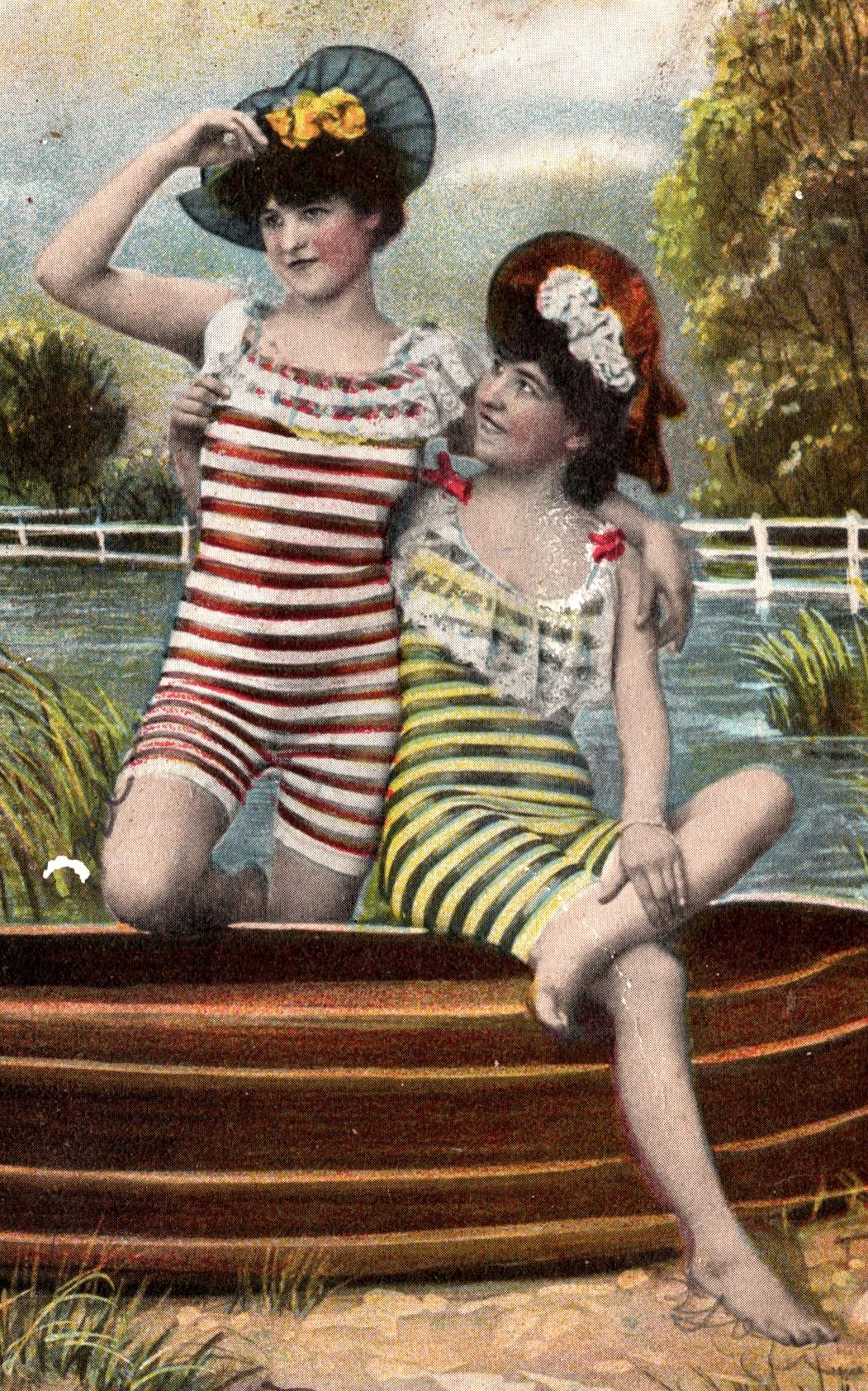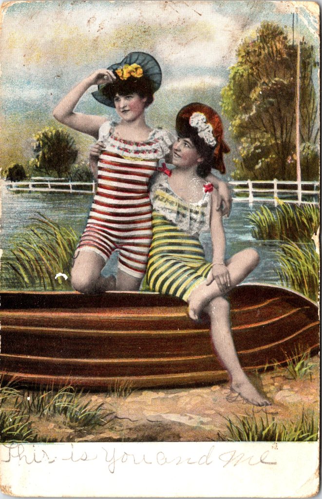 This hand colored vintage real photo postcard features two young and affectionate women wearing striped bathing suits. They seem to be in good spirits. The writer of this postcard wrote a caption on the front of the card stating “This is you and me.”. The postmark of this card indicates that it was mailed in 1909. The postcard is hand colored. SOLD