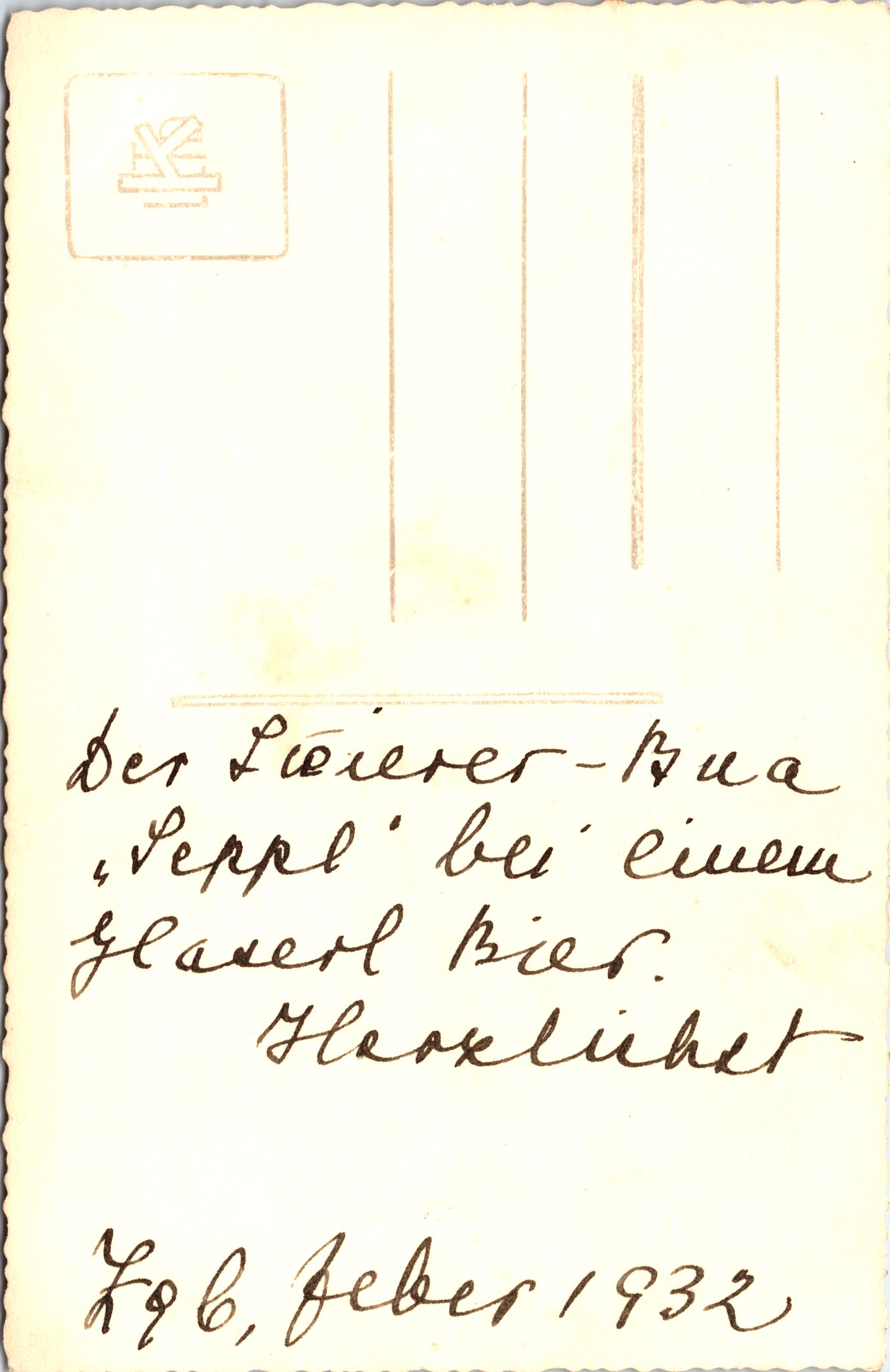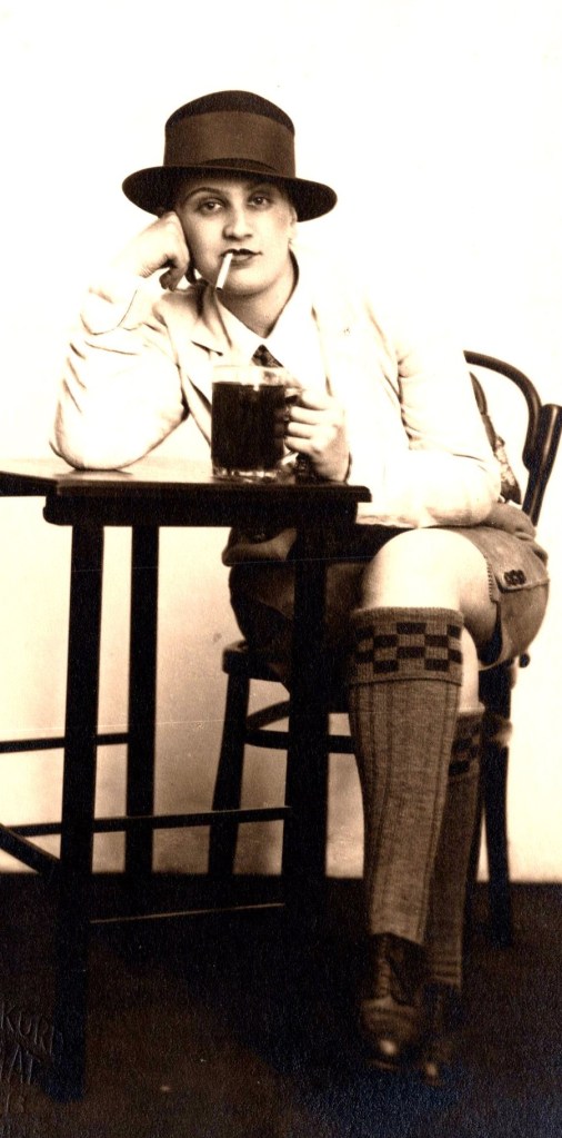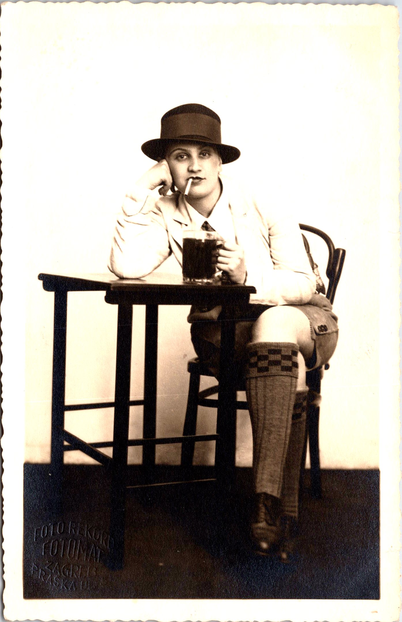 This provocative vintage real photo postcard features a pretty young woman drinking a mug of beer and smoking a cigarette. This postcard is provocative and meant to be sexually charged. This postcard may be gay themed. This postcard photo is a studio card and is likely one-of-a-kind. An inscription on the reverse of the card is dated 1932. SOLD