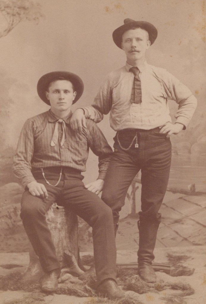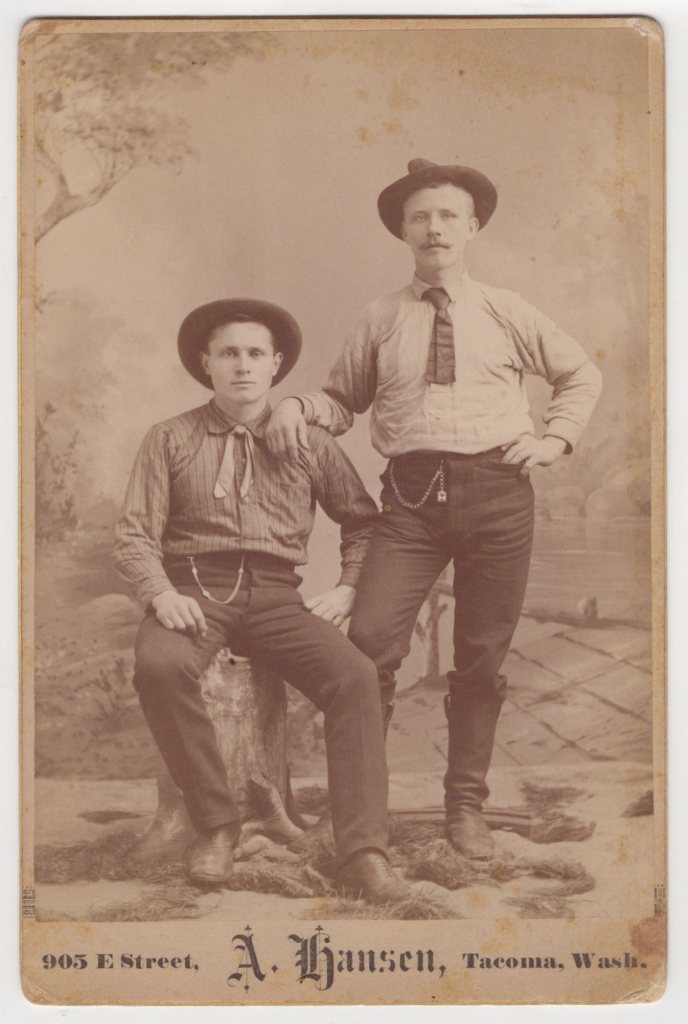 This cabinet card portrait features two affectionate men posing for their photo at the studio of Andrew Hanson, in Tacoma, Washington. The men are well dressed and wearing Western fashion. Both men are wearing ties and have pocket watches. Hanson was an active photographer in Tacoma circa 1891-1899. He operated as A. Hanson and also Andrew Hansen & Son. SOLD