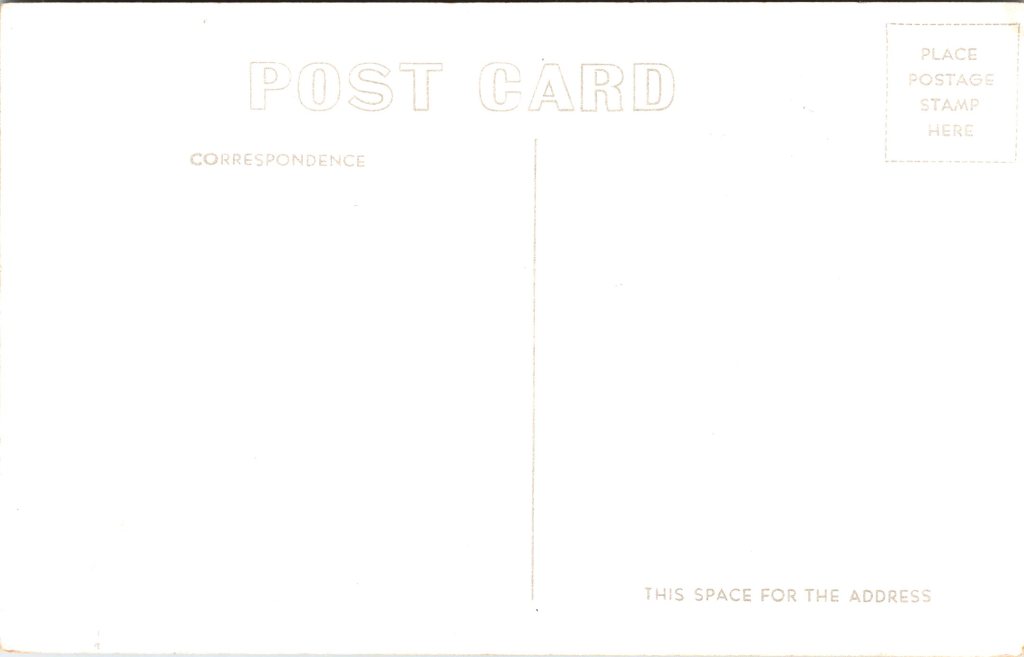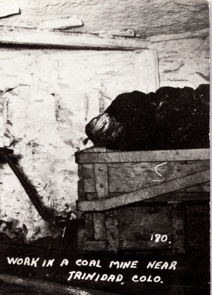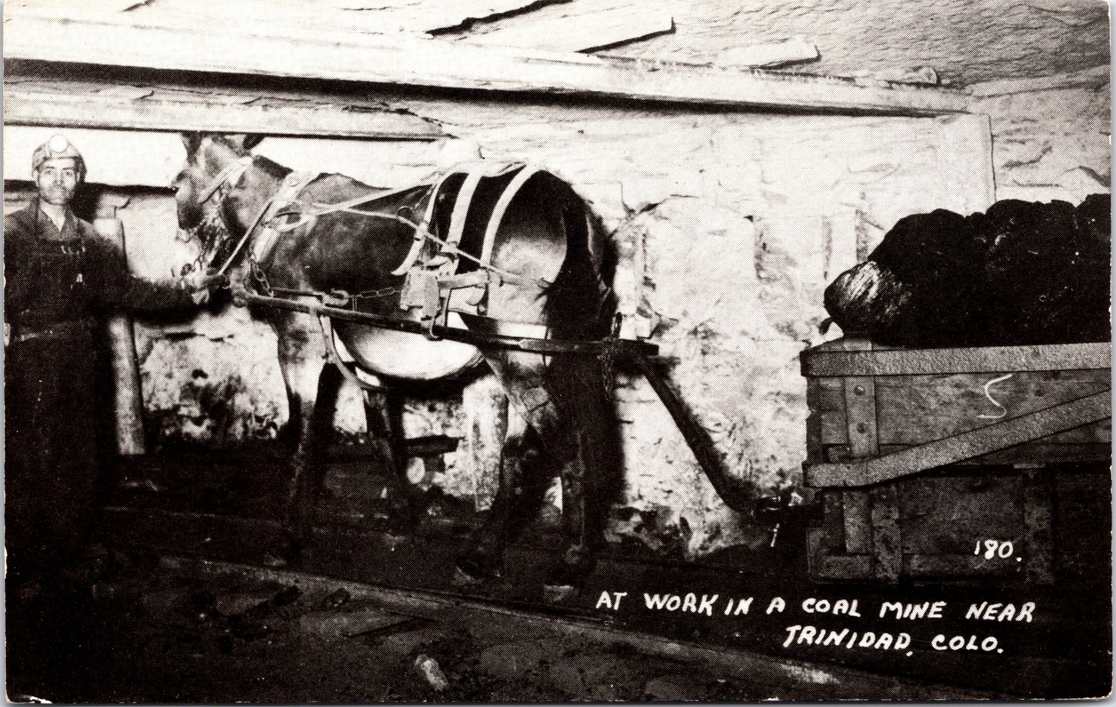 This vintage real photo postcard features a view of a man and a mule at work in a coal mine near Trinidad, Colorado. The mule is pulling a small rail car along a narrow gauge track. The miner is wearing a hard hat equipped with a light and miner’s clothing. SOLD