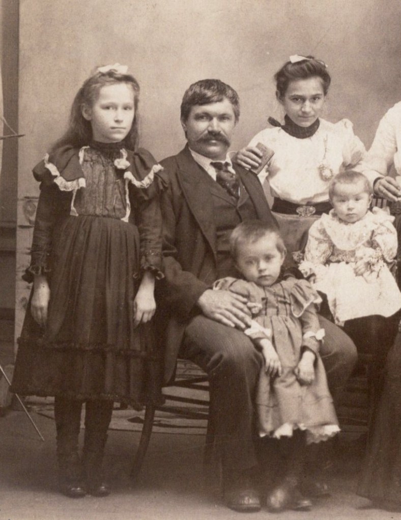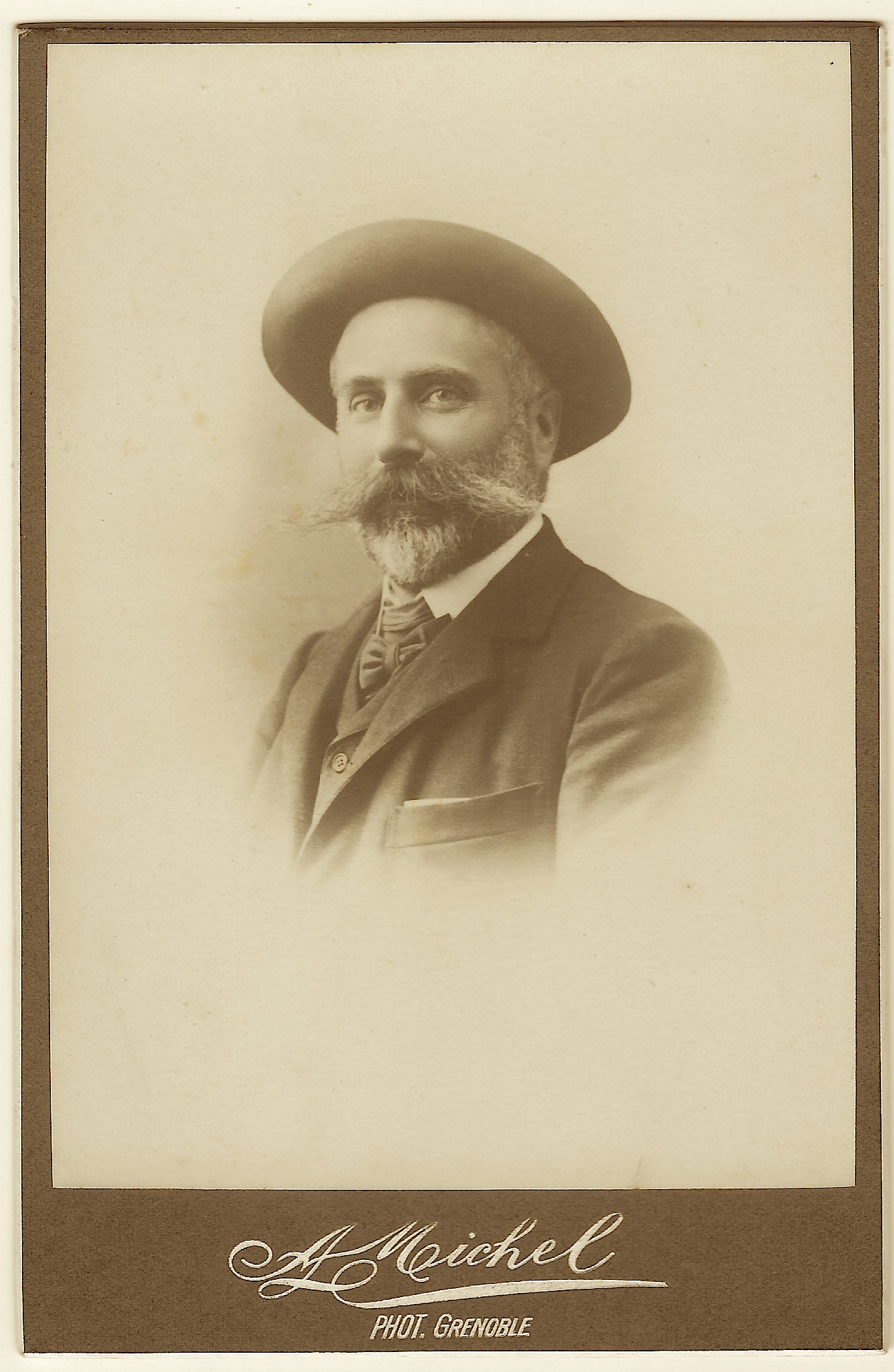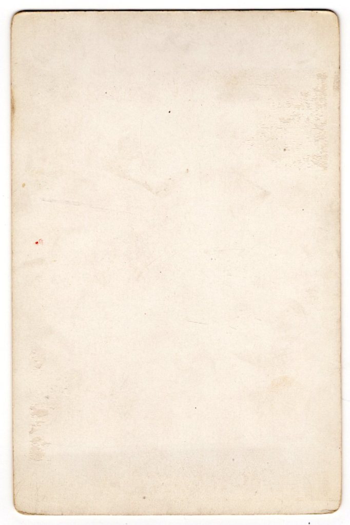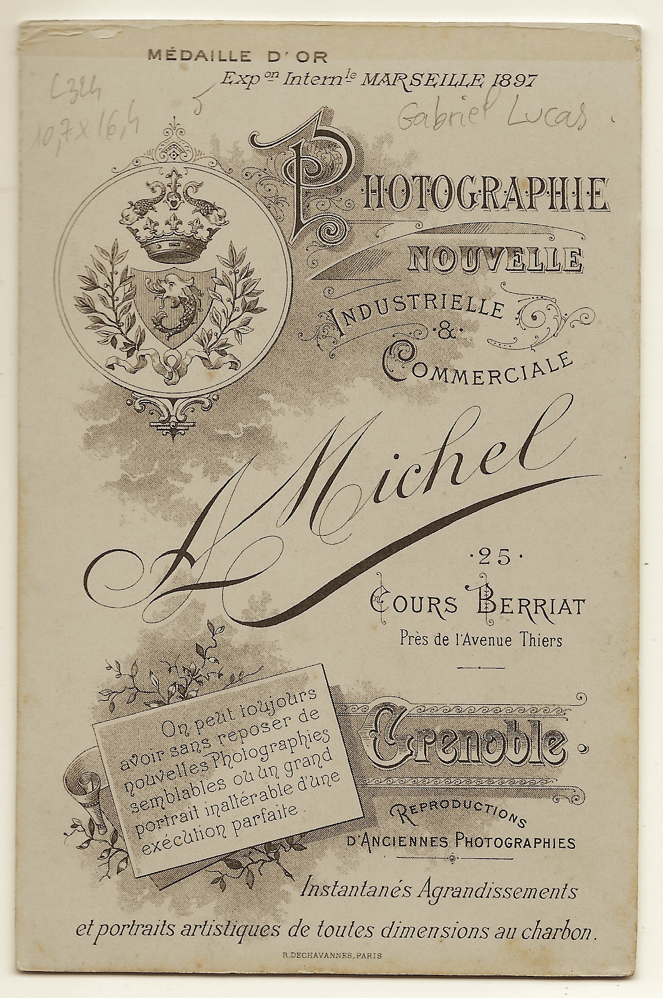 This cabinet card photograph features a dapper older man with an exquisite mustache. The gentleman’s impressive mustache may be one of the widest mustaches that I have ever seen. He has a sparkle in his eyes but it is impossible to ascertain if he is smiling because his lip sweater is blocking our view. The photographer of this cabinet card portrait is A. Michel. He operated a studio in Grenoble, France. Grenoble is in the Auvergne-Rhone-Alpes region of southeastern France. It is known as a center for winter sports. Advertising on the reverse of the cabinet card indicates that Maichel won a medal at an exhibit in Marseille in 1897. The gentleman in the photograph is identified on the verso as Gabriel Lucas. This portrait was likely taken circa 1900. SOLD