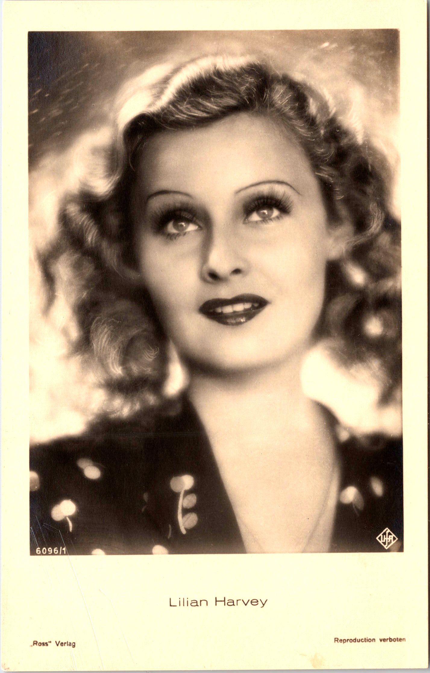Real photo postcard #1 features Anglo-German actress and singer, Lillian Harvey (1906-1968). Her acting base was in Germany. Harvey was born in Hornsey, England to an English mother and a German father. During World War I her family was “trapped” in Magdeburg, Germany and Harvey was sent to live with her Swiss aunt. After the war she finished school in Berlin and than studied voice and dance at the Berlin State Opera. In 1924 she earned a role as a revue dancer in Vienna. This was followed by her first movie role which was in an Austrian film named “The Curse”. Thereafter, she starred in multiple silent films. Her first leading role was in “The Passion” (1925). Because of her voice training, Harvey was able to make the transition into “talkies”. She and actor Willy Fritsch became the “dream couple” of German movies. The pair acted together in eleven movies. In the 1930’s Harvey’s films appeared in both German and English and she became popular outside of Germany. She went to Hollywood and made four movies for the Fox Film Corporation (this postcard is from that period). In 1935, Harvey returned to Germany. She appeared in several more films and soon she was under the watchful eye of the Gestapo. Harvey had many Jewish friends in the film industry and she was supportive of them. By 1939, Miss Harvey was forced to leave Germany, leaving behind valuable real estate holdings. She went to France where, in 1940, she made two movies for director Jean Boyer. In 1943 she was stripped of her German citizenship because she had performed for French troops. When southern France was occupied by the Nazis in 1942, she emigrated to the United States. During the war she did some theatre acting and also worked as a homeside volunteer nurse. After the war, Harvey relocated to Paris. She went on a world tour as a singer and in 1949 made appearances in West Germany. She spent her retirement on the French Riviera (Antibes) where she had a souvenir shop and raised snails for escargot. Harvey was married one time. Her four year marriage to theater director Hartvig Valeur-Larsen ended in divorce. Eventually she settled down with her female partner Else Pitty Wirth (1907-2007). Interestingly, the two women are buried together in Antibes. The imdb gives Harvey 54 acting credits between 1925 and 1940. Interestingly, Lillian Harvey’s name is mentioned in Quentin Tarantino’s film “Inglorious Bastards” (2009). One of her songs is played on a phonograph and in addition one of the characters in the film mentions liking Harvey’s performance in a film and Joseph Goebbels becomes angry and insists her name never be mentioned in his presence. Click on the link below to hear the Lillian Harvey/Willy Fritsch duet used in the Tarantino movie. The 1936 song is titled “Ich Wollt Ich War Ein Huhn” (I Wish I Was A Chicken). Now would be a good time to discuss this postcard portrait of Miss Harvey. She is looking quite decorated in this photograph. She is wearing a garland of leaves in her hair, a very ornate necklace, a number of large bracelets, two giant rings, and a jeweled clasp on her dress near her cleavage. Note her very notable eye lashes. She is wearing a somewhat provocative dress and it is clear that the aim of the photographer is to emphasize Miss Harvey’s sexiness. The photographer and Miss Harvey succeeded in accomplishing this goal. The postcard was published by the German firm Ross Verlag and was part of a series (no. 8679/1). The postcard credits Fox films. SOLD