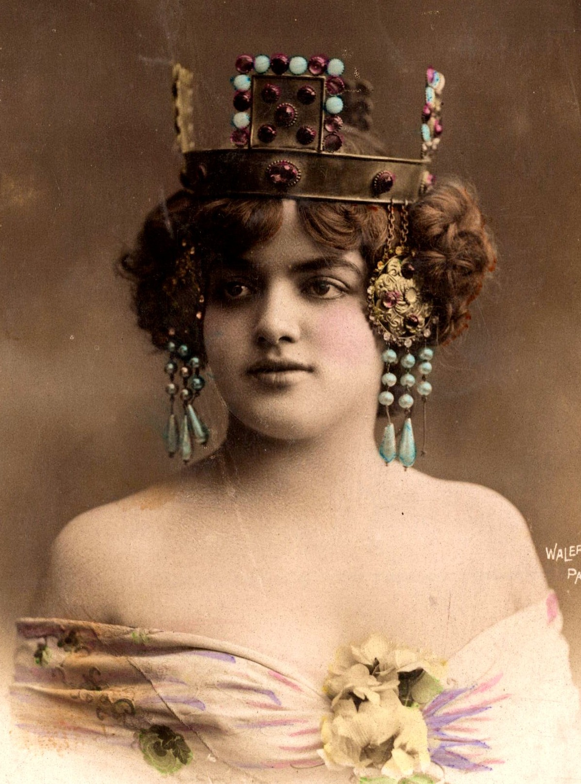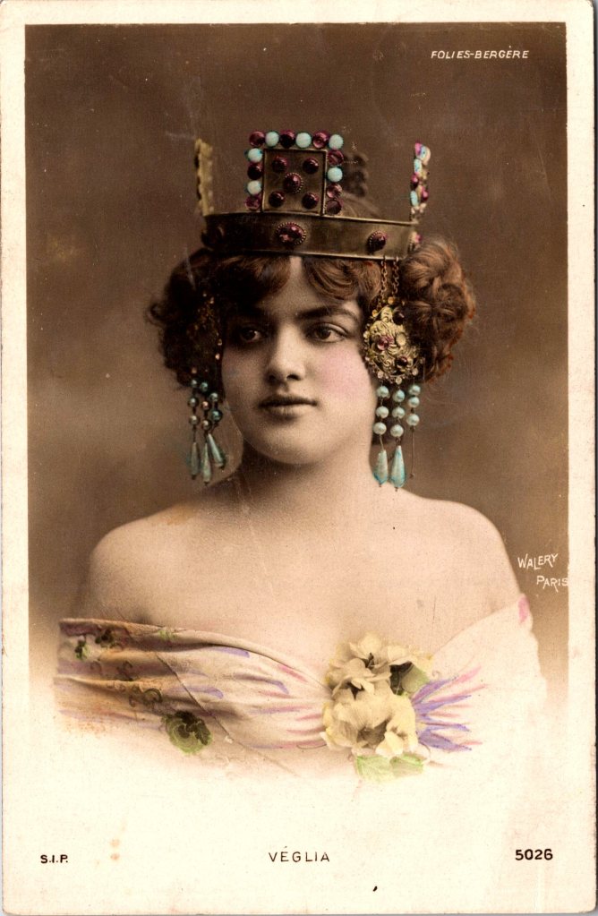 This vintage real photo postcard features performer, Miss Veglia. The title on the card indicates that she performed at the Folies Bergere, in Paris France. This actress may be Tina Veglia who was a silent film actress. One of the films that she is noted for is “The Three Musketeers” (1918).She is also listed as appearing in two Italian silent films. Interestingly, the word “Veglia”, translated from Italian to English, means “Vigil”. The portrait of Miss Veglia was hand tinted. She is wearing quite the interesting head piece. The ornate jeweled piece is crownlike and has a hodgepodge design. The message on this postcard, written in French, is captivating. A translation app translates the message as ” I suffer in silence and I do not complain. Not seeing me, you may think I’ve moved on, but despite that, I will love you always. I’m letting a little bit of hope shine through. Try to guess who is sending you this card…”. This is an extremely dramatic message. I wonder what eventually happened. Did the writer and recipient ever get together and live “happily ever after”? This photo portrait was taken by Walery at his Paris studio. He was a well known and talented celebrity photographer. The postcard was published by SIP as part of a series (no.5026). The postcard has a Belgian stamp and the care is addressed to someone in Courcelles-Pont-à-Celles, Belgium. (SOLD)