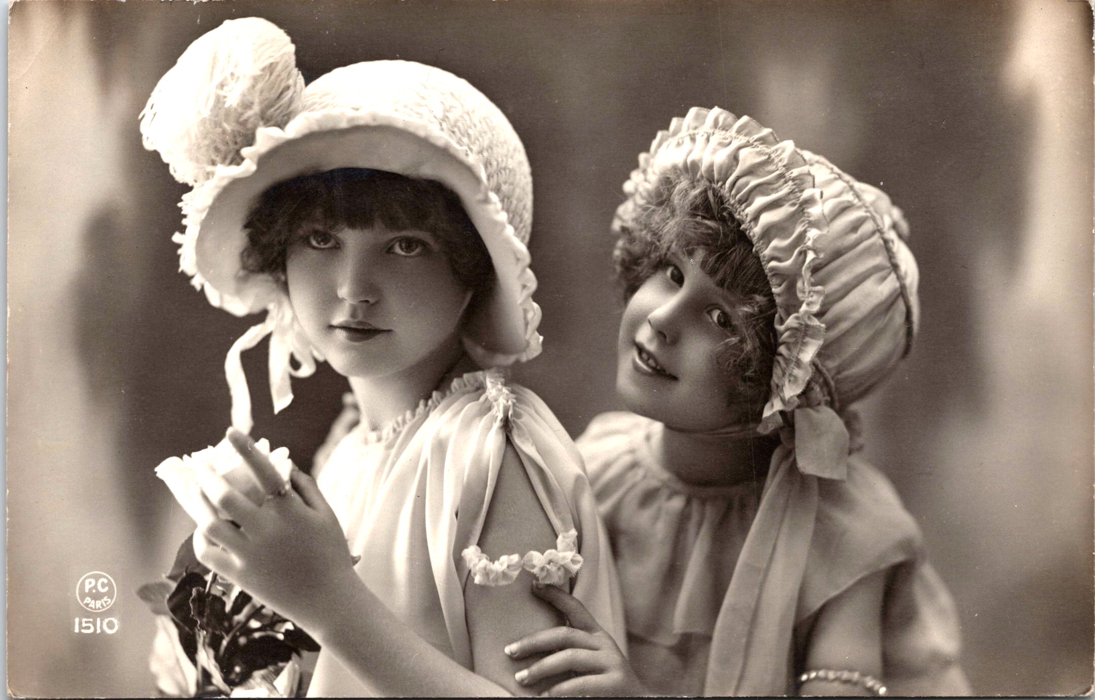 This vintage real photo postcard captures two very adorable and beautifully dressed little girls. They have magnificent smiles and sparkling eyes. This postcard was produced by PC Paris as part of a series (No.1510). The P.C logo is an abbreviation for Papeteries d Levallois-Clichy. The firm published a variety of real photo postcard topics including portraits of pretty models, nudes, views, and holiday cards. The company was active in the 1920’s. Here is the translation of the French message on the postcard: “Very Dear Cousin Agathe, On the occasion of your lovely name day,receive my best wishes and greetings, as well as those of my parents. I also send you my sweetest kisses to you and to all your family. Your little cousin, M. Soensur” (SOLD)