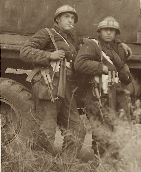 This photograph is enigmatic. Who are these soldiers? What nation’s army do they serve in? I know that a number of Russian Army helmets have similar stars. What do the rectangular insignias mean that appear on both sides of the helmet’s star? What is the translation of the inscription on the reverse of the photo and what language is it written in? Note the men’s weapons slung over their shoulders. SOLD