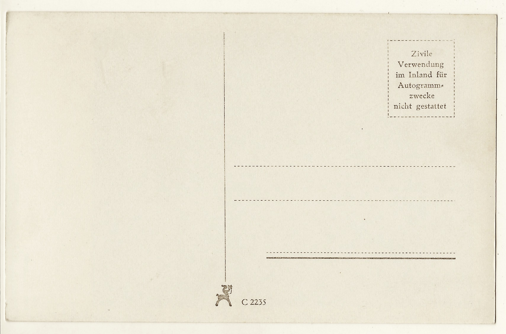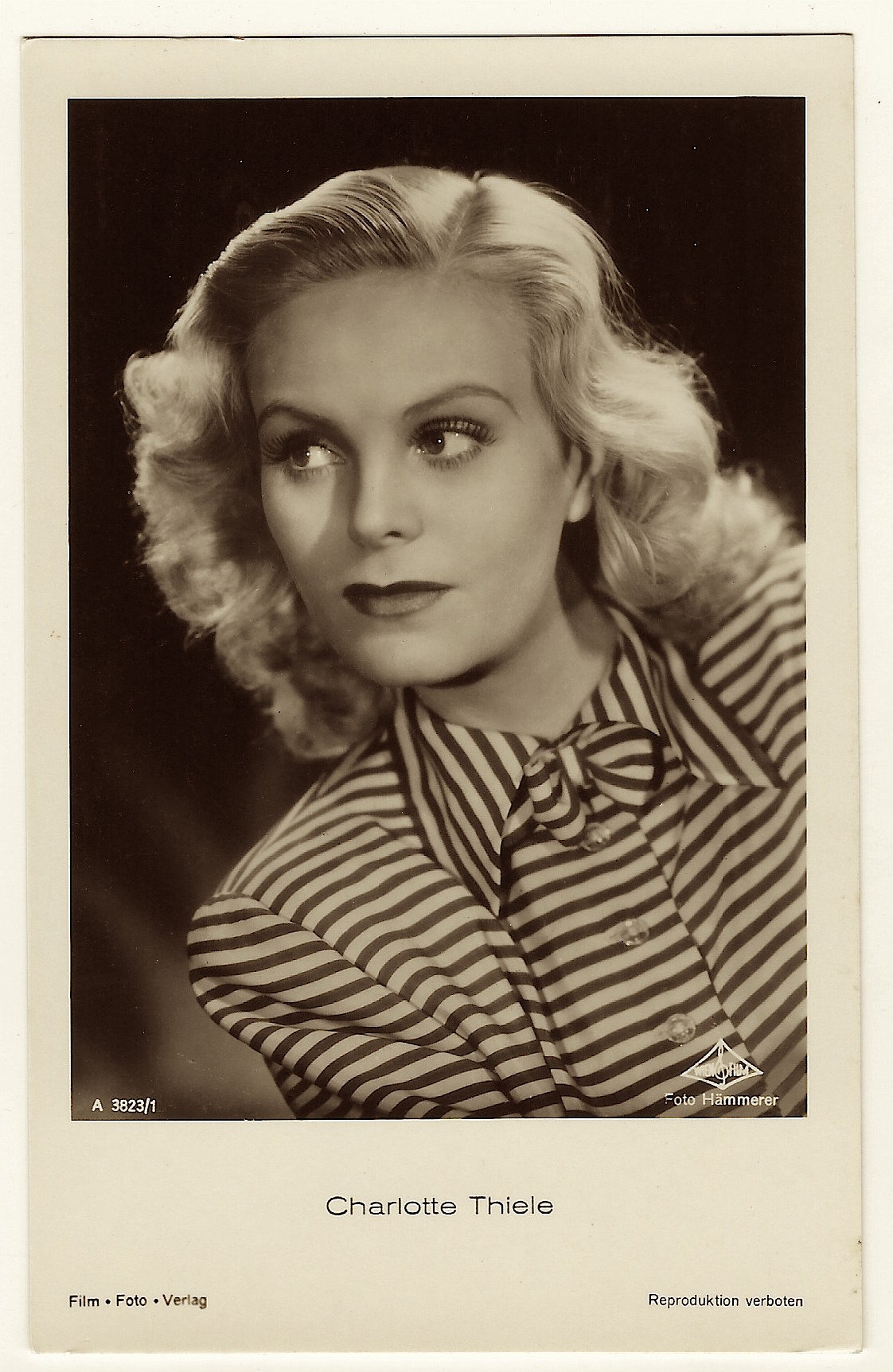 Charlotte Thiele (1918-2004) was a German actress. She was quite pretty. Thiele was born in Berlin and attended acting school at the “Schauspielhaus Berlin”. Her acting debut occurred in 1938 in a film directed by Kurt Hoffmann, a well known German film director that directed 48 films between 1938 and 1971. In 1939, she appeared in “We Dance Around The World” and the feature film made her an instant star. During the 1930’s and 1940’s she was often cast in roles where she played the “cool blonde”. In 1941, she appeared in a controversial propaganda film. The movie was a controversial pro euthanasia vehicle. The plot was about a successful doctor who is compelled to make a “heart wrenching” decision when his pretty young wife is diagnosed with multiple sclerosis. This movie was aimed at making the public more supportive of Germany’s euthanasia program and was a portend of things to come. She is also known for playing a Lady Astor, in the film, Titanic (1943). In 1944, Thiele appeared in her last movie. Her career was ruined by Propaganda Minister Joseph Goebbels because she had rejected his advances. She went as far as throwing the dedicated engraved powder box he have her, into the trash. Thiele’s first marriage was to a prominent surgeon who was an assistant to a famous German surgeon.Her second husband was a Croatian diplomat. The couple emigrated to Argentina in 1944. She returned to Germany in 1954 and failed in her attempt to resume acting. However, in 1956, she appeared in an episode of the American television series “Douglas Fairbanks Jr. Presents/ Rheingold Theater”. The IMDb reports that Thiele appeared in 7 films. She died in Berlin in 2004. This vintage real photo postcard was published by Film-Foto-Verlag and was part of a series (no. A3823/1). The photographer was Hammerer for Wien-Film. It was published in 1943. The postcard features Miss Thiele in her role in the Wien-Film “Am Vorabend”. SOLD