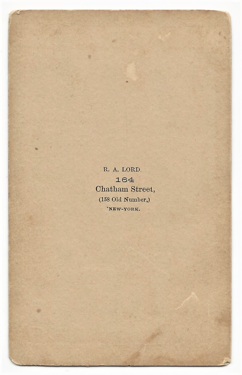 This carte de visite photograph features a lovely little girl wearing unusual attire. I would guess that her dress is indicative of a specific ethnic group. I do not know what ethnicity that might be. The detailed stitching on her dress is pretty. Note the striped accessory (scarf?) on the side of her dress, as well as her feathered headband. Her ringlet curls are adorable. This cdv was taken at the R. A. Lord studio in New York City. He operated his studio in the 1860’s. He photographed civil war soldiers and civil war era citizens during the conflict. A couple of his photographs are in the collection of California’s J. Paul Getty Museum. SOLD