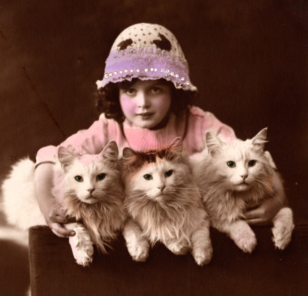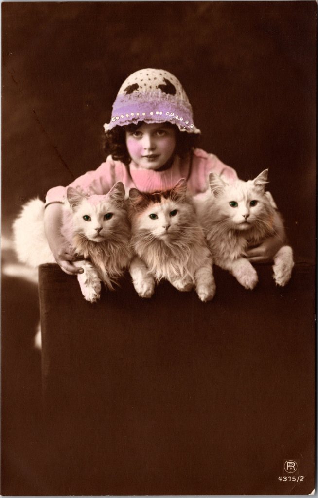 This color tinted vintage real photo postcard features an adorable little girl and her three beautiful cats. The child is wearing a pretty hat. The cats are extremely photogenic. This postcard is dated 1914 and was published by Rotophot (RPH) as part of a series (No.4315/2). Rotophot eventually morphed into Ross Verlag. SOLD