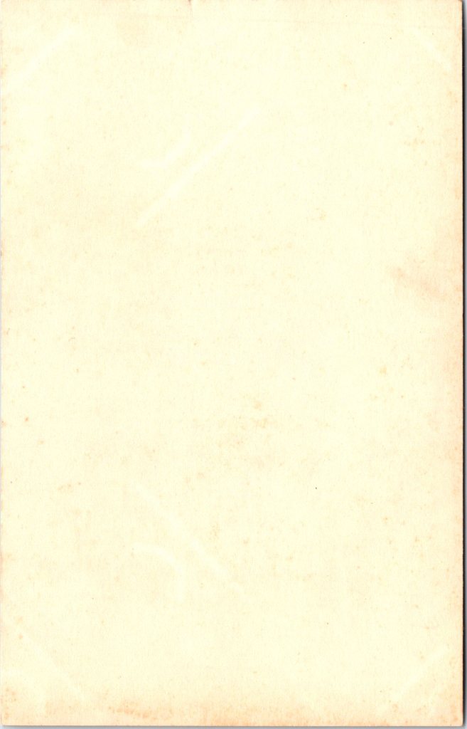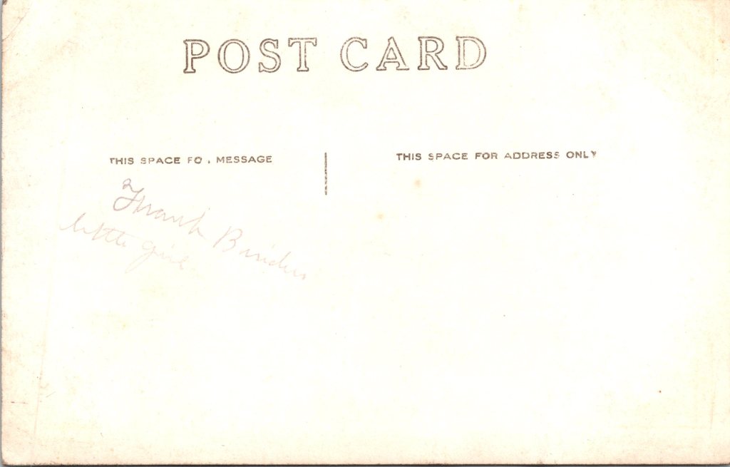 Seated on a small toy piano, a young girl gazes directly into the camera with a serious, almost puzzled expression. Her light-colored coat, featuring large buttons and a Peter Pan collar, suggests a chilly season. Her dark stockings contrast sharply against the crisp fabric of her coat, and her slightly scuffed lace-up shoes hint at a child often at play. Her blonde hair, parted slightly to the side, is adorned with a large white bow, a common fashion accessory for young girls of the era. Beside her, a well-loved wooden wagon carries an assortment of cherished toys. A china-head doll dressed in a long, slightly tattered gown sits upright, her delicate painted face conveying a timeless charm. Next to her, a worn plush teddy bear with jointed limbs lounges against the wagon’s edge, its fur thinned from years of companionship. A smaller doll, with a cloth body and a painted bisque head, rests in a heap, suggesting it may have been hastily placed there before the photo was taken. Behind the girl, the toy piano upon which she perches adds a striking visual element. The intricate decals and ornate detailing on its wooden frame indicate it was once a prized plaything. Its keys, some appearing slightly askew, reveal the signs of youthful enthusiasm. The setting appears to be an outdoor porch or wooden structure, the horizontal planks of the wall providing a rustic backdrop. The natural light casts soft shadows, enhancing the depth and character of the image. The reverse side of the postcard features a typical divided-back design, indicating it dates from the early 1900s. A faint handwritten inscription reads “Frank B’s little girl”. Franks’s last name is likely “Binder”. The handwriting is delicate and slightly faded, but still legible. SOLD