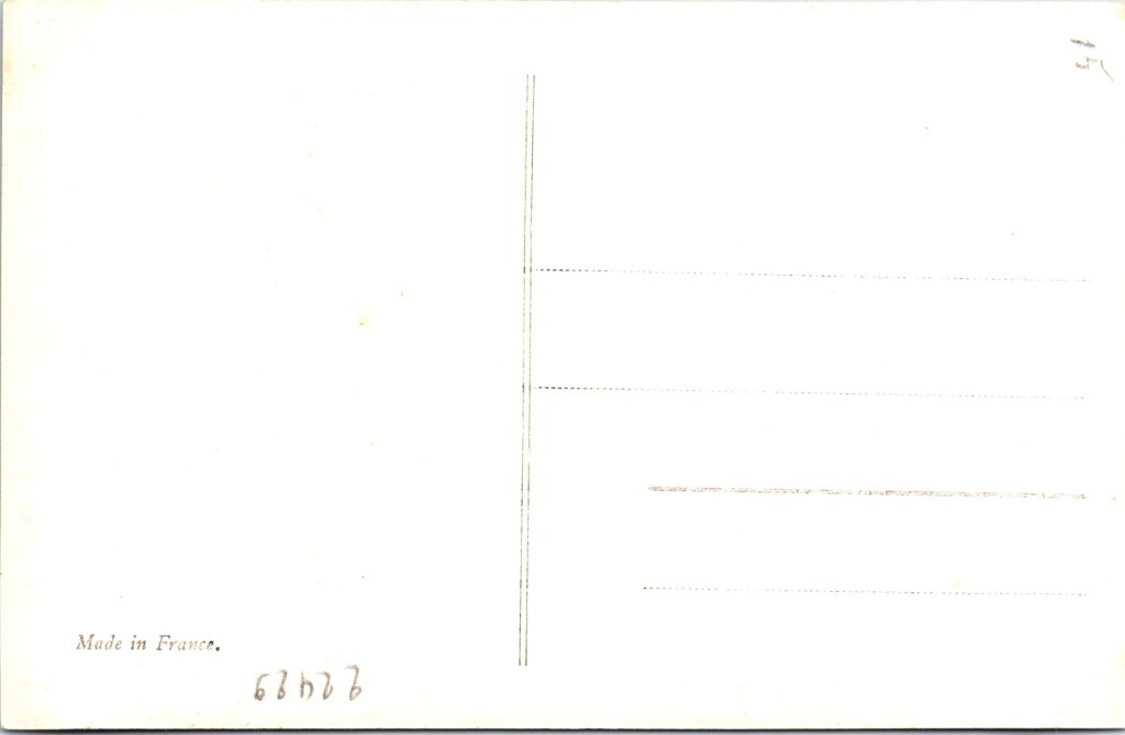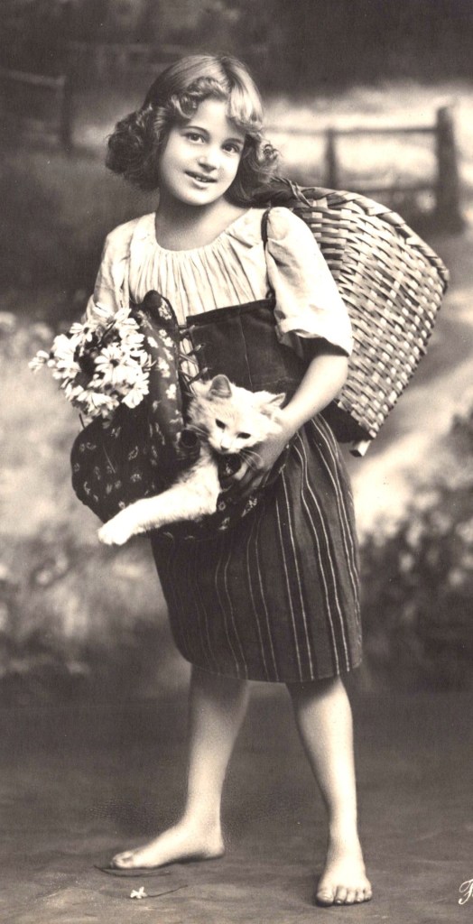 This color tinted vintage real photo postcard features a barefoot adorable little girl and her white cat that she is carrying in a cloth bag. She is also carrying a bouquet of flowers and has a basket on her back. The model seen in this postcard photo is most likely, Hani Reinwald, sister of popular postcard model, Grete Reinwald. Both girls became stage and film actresses. I own another postcard from the same series as this postcard. That postcard is postmarked 1913, indicating that this postcard also dates back to that year. This French postcard was published by Fauvette as part of a series (No.1319). SOLD