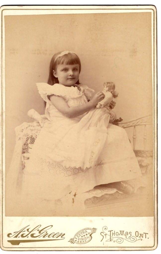 ADORABLE LITTLE GIRL AND HER DOLL : ST. THOMAS, ONTARIO, CANADA : CABINET CARD