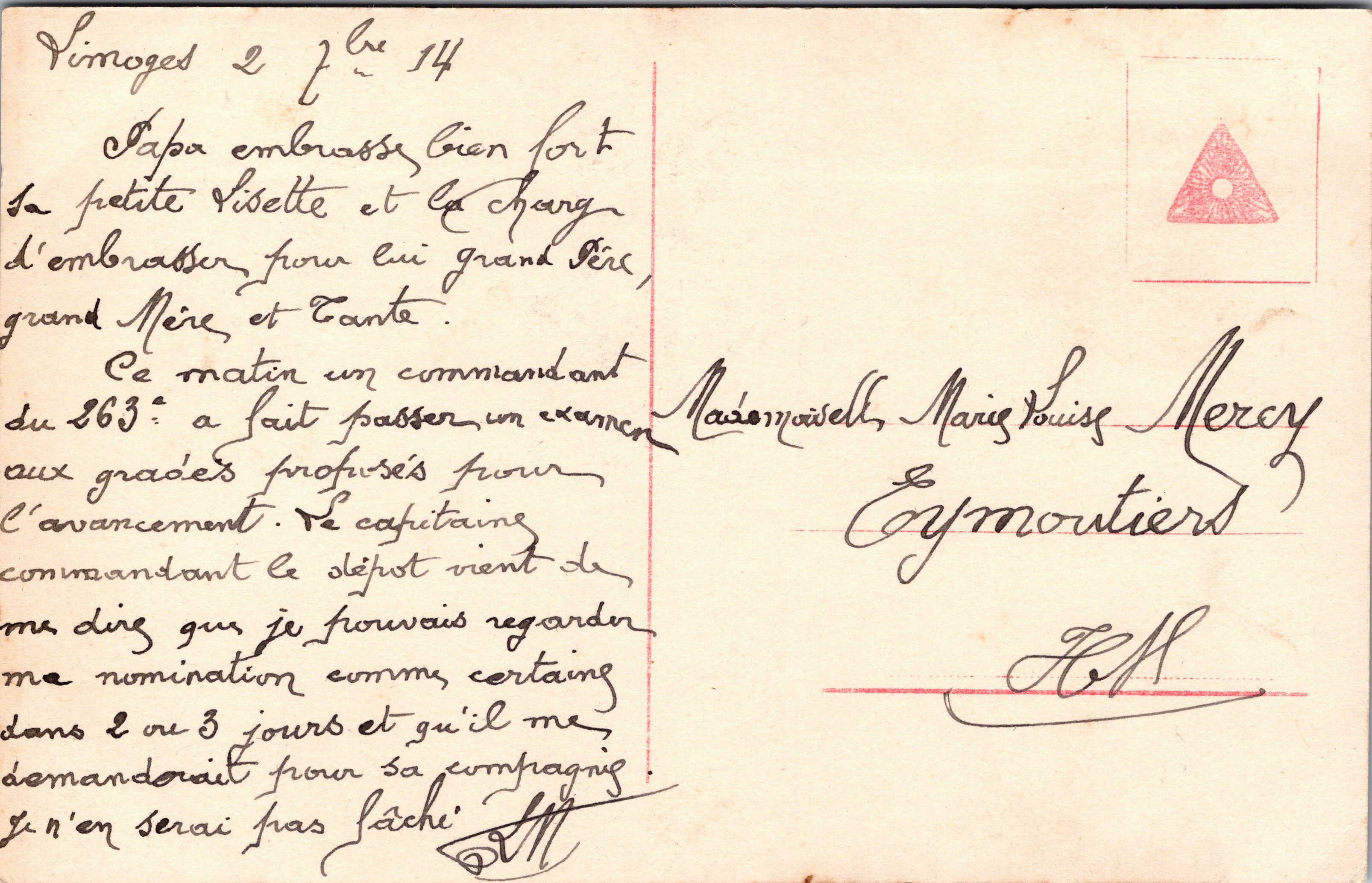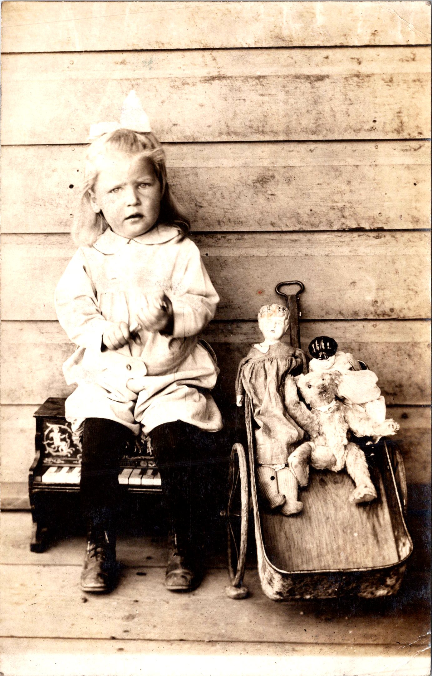 Seated on a small toy piano, a young girl gazes directly into the camera with a serious, almost puzzled expression. Her light-colored coat, featuring large buttons and a Peter Pan collar, suggests a chilly season. Her dark stockings contrast sharply against the crisp fabric of her coat, and her slightly scuffed lace-up shoes hint at a child often at play. Her blonde hair, parted slightly to the side, is adorned with a large white bow, a common fashion accessory for young girls of the era. Beside her, a well-loved wooden wagon carries an assortment of cherished toys. A china-head doll dressed in a long, slightly tattered gown sits upright, her delicate painted face conveying a timeless charm. Next to her, a worn plush teddy bear with jointed limbs lounges against the wagon’s edge, its fur thinned from years of companionship. A smaller doll, with a cloth body and a painted bisque head, rests in a heap, suggesting it may have been hastily placed there before the photo was taken. Behind the girl, the toy piano upon which she perches adds a striking visual element. The intricate decals and ornate detailing on its wooden frame indicate it was once a prized plaything. Its keys, some appearing slightly askew, reveal the signs of youthful enthusiasm. The setting appears to be an outdoor porch or wooden structure, the horizontal planks of the wall providing a rustic backdrop. The natural light casts soft shadows, enhancing the depth and character of the image. The reverse side of the postcard features a typical divided-back design, indicating it dates from the early 1900s. A faint handwritten inscription reads “Frank B’s little girl”. Franks’s last name is likely “Binder”. The handwriting is delicate and slightly faded, but still legible. SOLD