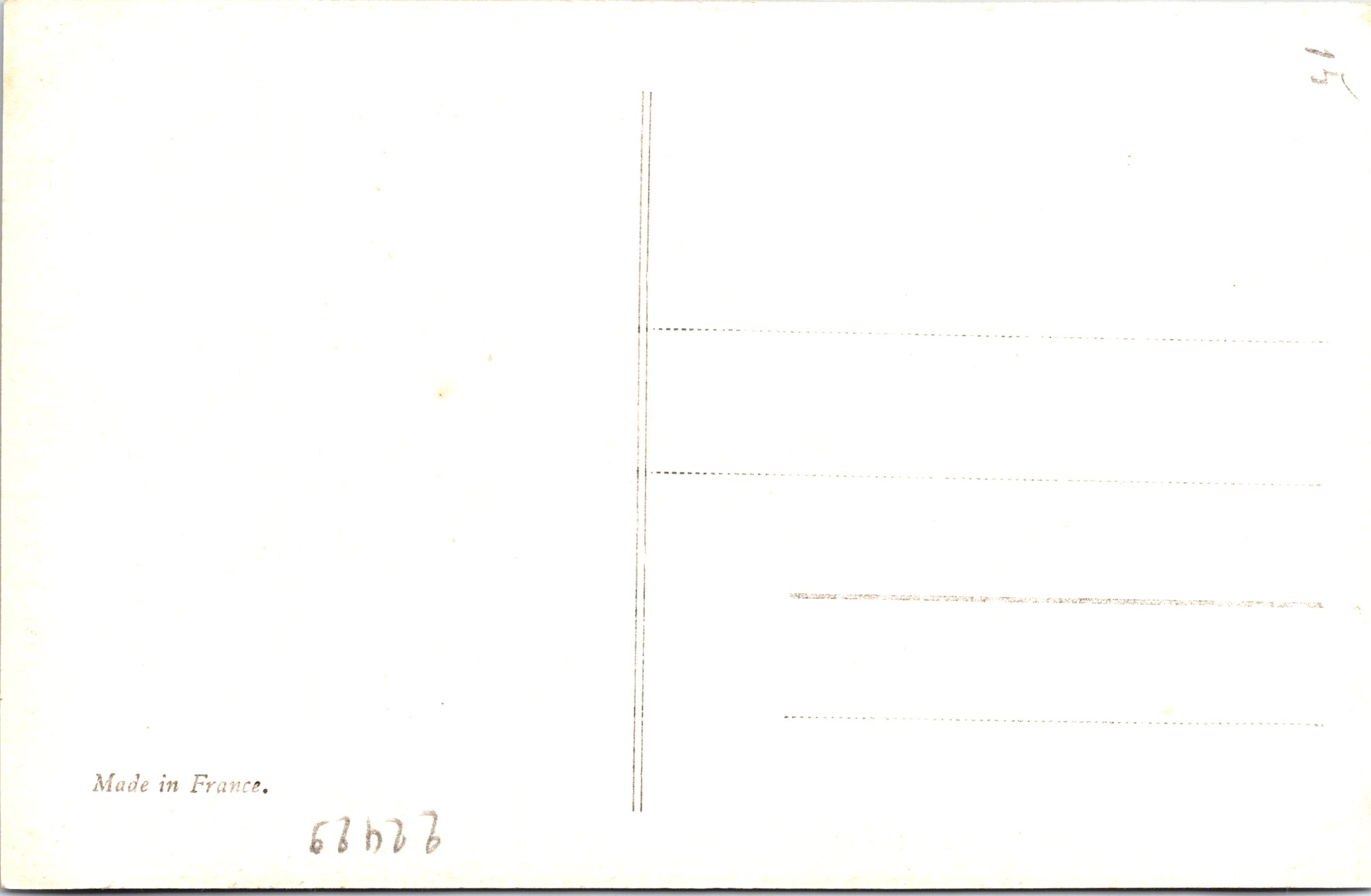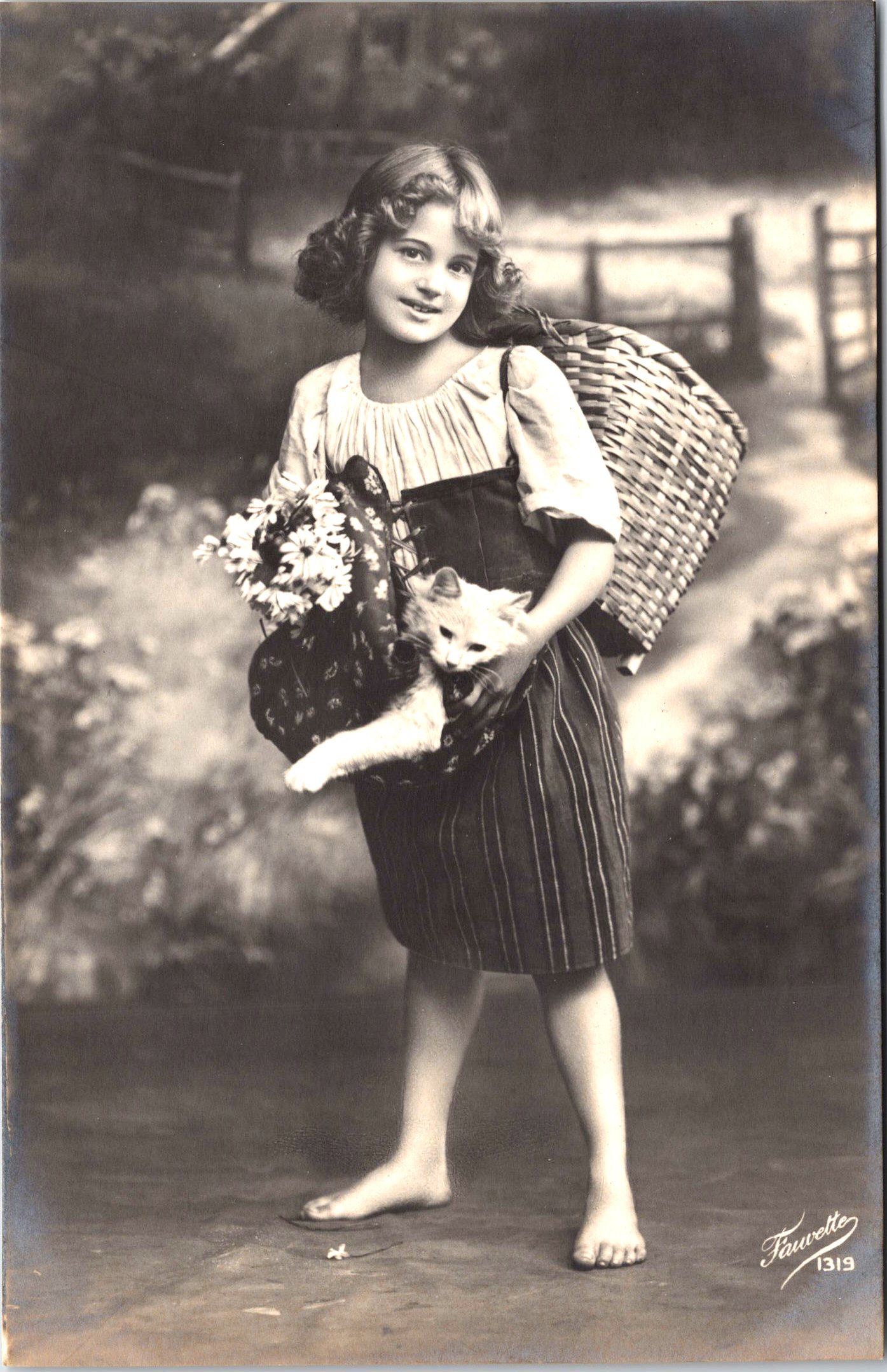 This color tinted vintage real photo postcard features a barefoot adorable little girl and her white cat that she is carrying in a cloth bag. She is also carrying a bouquet of flowers and has a basket on her back. The model seen in this postcard photo is most likely, Hani Reinwald, sister of popular postcard model, Grete Reinwald. Both girls became stage and film actresses. I own another postcard from the same series as this postcard. That postcard is postmarked 1913, indicating that this postcard also dates back to that year. This French postcard was published by Fauvette as part of a series (No.1319). SOLD
