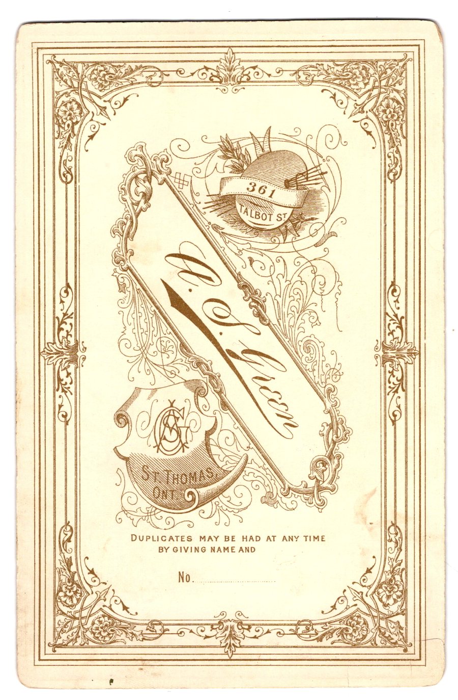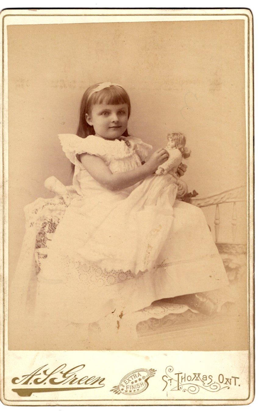 This cabinet card portrait features an adorable little girl sitting on a chair and holding a doll. She is wearing a “fancy” dress. The child appears quite content as she poses for her photograph at the A. S. Green studio in St. Thomas, Ontario, Canada. Anson S. Green was active as a photographer in St. Thomas between 1888 to 1893, according to Glen C. Phillips’s “The Ontario Photographers List (1851-1900)”. SOLD