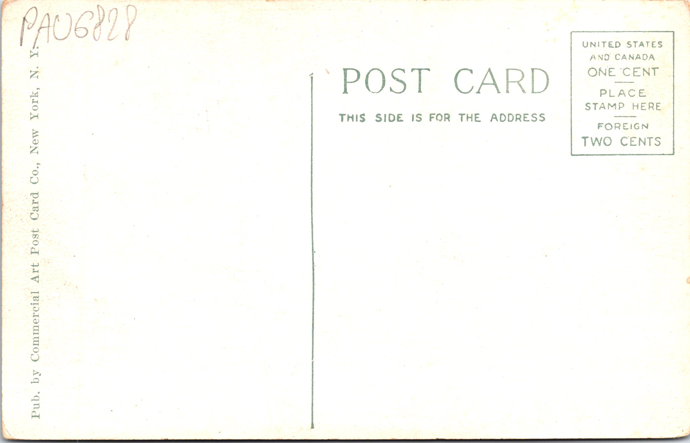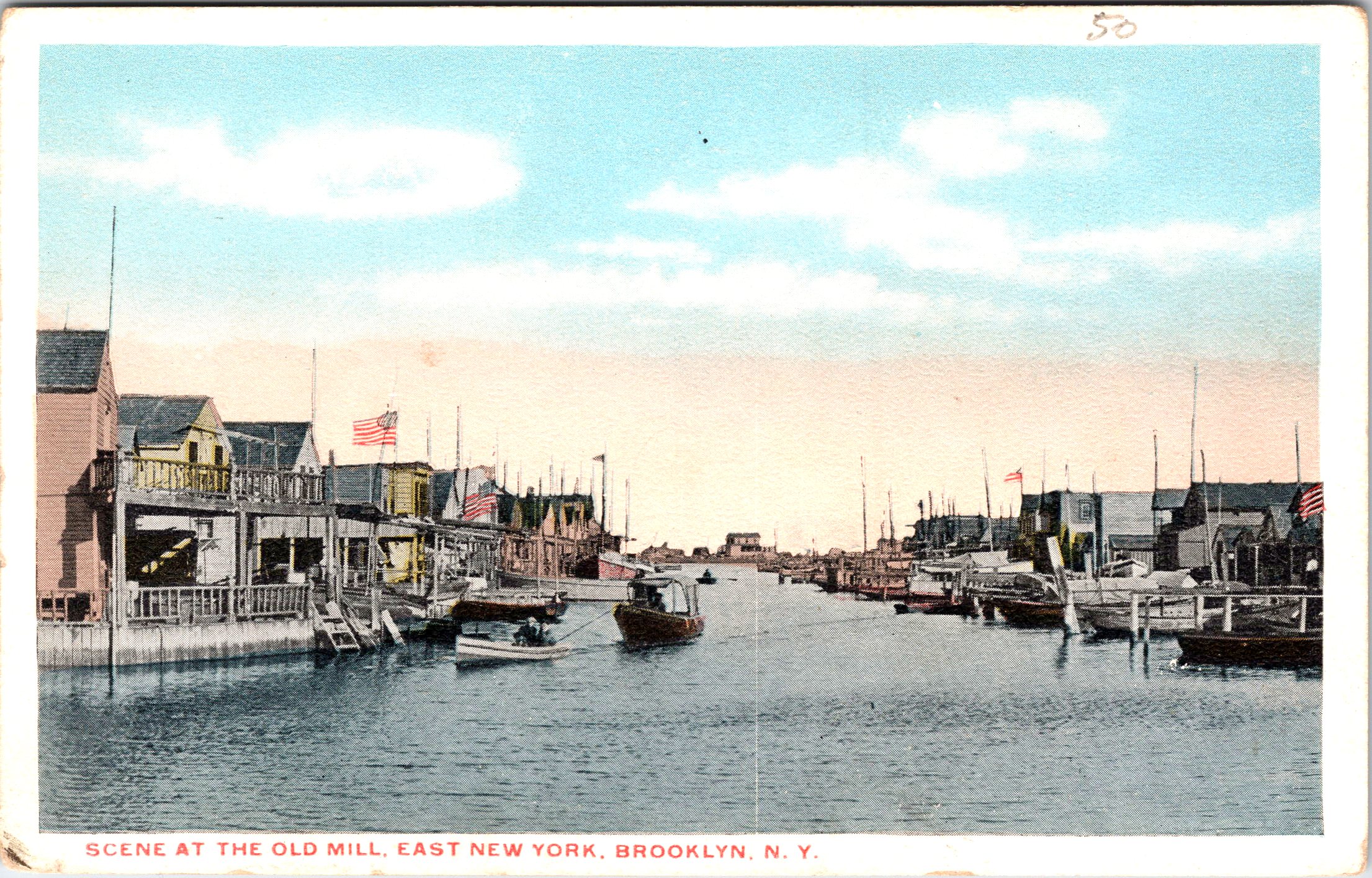 This vibrant, hand-tinted postcard captures a nostalgic waterfront scene titled, “Scene at the Old Mill, East New York, Brooklyn, New York.” A peaceful waterway stretches into the distance, flanked on both sides by wooden piers, weathered clapboard boathouses, and numerous small fishing boats and rowboats moored at the docks. Several American flags wave proudly from the buildings and masts, suggesting a patriotic atmosphere—perhaps near the Fourth of July. The canal is lively yet serene, with a few boats actively drifting in the calm water and others docked beside wooden walkways. The pastel tones of the sky, combined with the charming architectural details of the boathouses—painted in soft yellows, pinks, and blues—lend the postcard an idyllic charm, reminiscent of early 20th-century East New York before urbanization transformed the landscape. This postcard was published by the Commercial Art Post Card Co., New York, N.Y., a prolific publisher active in the early 20th century, known for scenic views and hand-colored lithographs. It is a divided back postcard with the stamp box indicating one cent for U.S. and Canada—suggesting a date range from the 1910s to early 1920s. (SOLD)