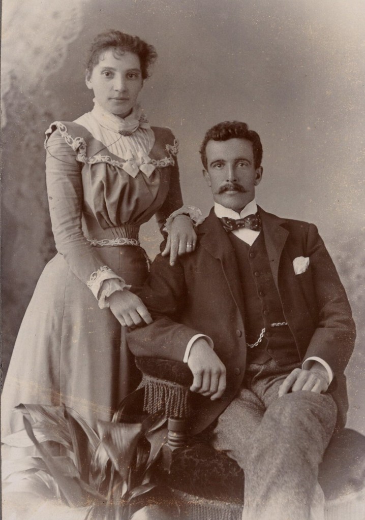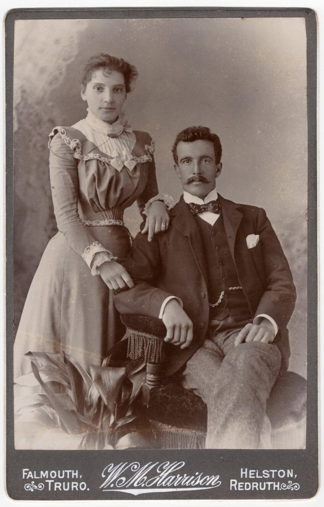 An attractive couple pose for their portrait in Falmouth, England. The couple are very well dressed and appear very comfortable in front of the camera. The photographer is W. M. Harrison. Harrison had studios in Falmouth, Helson, Truro and Redruth. William Marsden Harrison (1852-?) worked as a photographer in Scotland but worked in Falmouth beginning the early 1880’s. By 1900, Harrison had won over 30 medals for his photographs, many of them from international competitions (ie. France, Austria, Belgium, Holland). Judging by the back design, this cabinet card photograph is circa 1902. SOLD