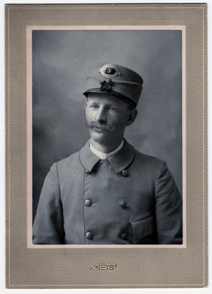 This is a striking vintage cabinet card photograph of a proud mail carrier from North Tonawanda, New York. He is dressed in a distinguished double-breasted uniform, complete with a high-collared coat and a matching cap adorned with an insignia marked with the title of U.S. Mail and the number “3.” His neatly groomed mustache and confident yet approachable expression add to the charm of this historical portrait. The photograph was taken by Kneis’ Photographic Art Studio, located at the corner of Schenck and Oliver Streets in North Tonawanda, NY.  The photographer is likely John Kneis. He is listed in the 1902 business directory that focuses on North Tonawanda and other nearby cities, including Buffalo, New York. The town of North Tonawanda, situated along the Niagara River, was a bustling industrial and shipping hub during this time, known for its lumber trade and manufacturing industries. Mail carriers like the gentleman in this photograph played a crucial role in connecting the growing community, ensuring the timely delivery of letters and packages. (SOLD)