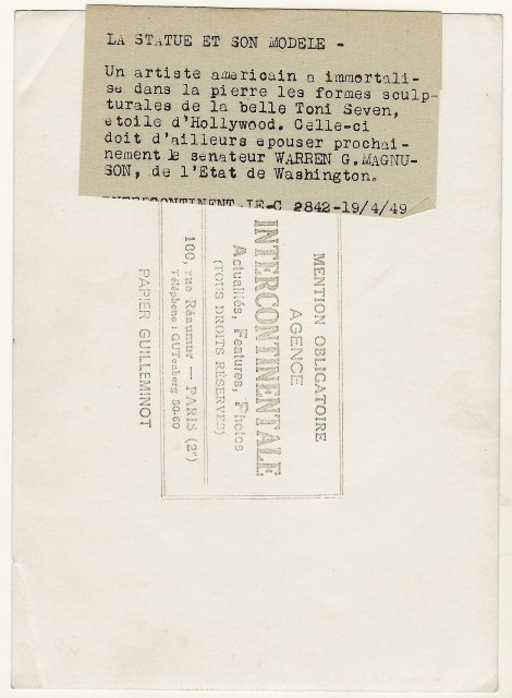 The photographer of this press photo must have been in a playful and creative mood at the time that this photograph was taken. The image features a statue and its model, side by side, in identical poses. The caption of the photograph, affixed to the reverse, indicates that the model is “beautiful” Hollywood star, Toni Seven. It also states that she was the fiance of Senator Warren G Magnuson of Washington state. The photograph was taken in 1949. Toni Seven (1922-1991) was born as June Elizabeth Millarde. Her mother was noted stage and silent film actress, June Caprice. Caprice also worked as a model. Toni’s father, Harry F Millarde, was a film director. Toni’s father died when she was just 8 years old. She was orphaned at age 13 when her mother died. Her grandparents took on the responsibility of raising young Toni. She was raised in the town of Great Neck, located on Long Island in New York state. An article in Time Magazine (1949) indicates that she was financially secure. It was reported that she was a heiress to a fortune worth 3 million dollars. It appears that Toni Seven was genetically loaded to become a performer. As Toni Seven, she was a popular American cover girl and actress, In the early 1940’s she played minor roles in three films. One of these films was the well known “Yankee Doodle Dandy” (1942). She later appeared in two more films. When World War II began, she became a volunteer at the “Hollywood Canteen”, The canteen offered food, dancing and entertainment to servicemen, many of whom were preparing to go overseas. Everything at the canteen was free for uniformed servicemen and servicewomen, She was named pin-up of the year by US soldiers in the European theater in 1945. In 1944, she changed her name to Toni Seven. She thought it would be fun to sign her name “Toni 7”. When the first pin-up exhibition in the United States was held in 1944, Toni Seven was featured along with many other beautiful models, including Jane Russell. In 1946, Seven reclaimed her original name. In 1949, newspapers ran articles asserting that Toni was romantically involved with Washington US Senator, Warren Magnuson. Although the caption of this press photo states that she and Magnuson were engaged, the pair never married. However, the couple dated on and off between 1948 and 1953. Looking at Toni Seven’s biographical data, it is clear that her acting career was unremarkable. Toni appeared in only five films. Stellarstar writes in the blog “Those Obscure Objects of Desire” that “Toni Sevin is proof that a girl who lands in Hollywood, has money to burn, a great press agent and more than enough beauty, can still end up a complete unknown”. Toni was successful in other areas of her life. She was a great horsewoman, and also excelled at swimming and tennis. She despised gossip but created some when she dated Errol Flynn and other celebrities. This press photo belonged to the Intercontinental agency, located in Paris, France. An additional photograph of Miss Seven can be found below. SOLD