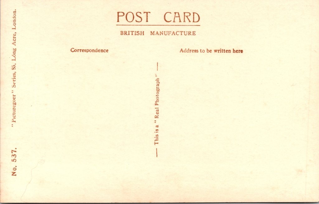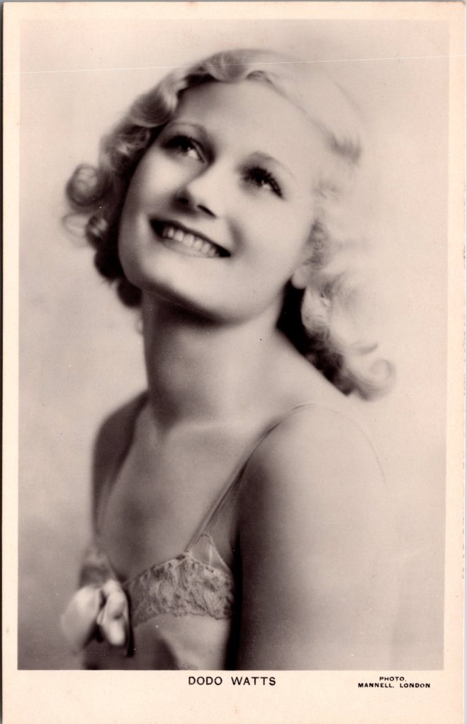 This vintage real photo postcard features British stage and film actress, Dodo Watts (1910-1990), She had one appearance on Broadway in “The Middle Watch” (1929).When she retired from acting, she became a career woman. She owned a successful millinery firm in London. She also worked as a casting director for three films. She cast Diana Rigg in her role in “The Avegers” television series. Watts also worked as a theatrical agent. The IMDb credits her with19 film credits between 1925 and 1953. This card was published by Picturegoer as part of a series (no.537). The photograph seen on this card was taken by George Mannell. His firm was located in London, England. SOLD