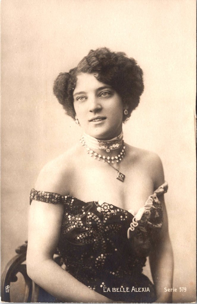 This vintage real photo postcard features pretty performer, La Belle Alexia. She was a dancer and was also likely an actress. Preliminary research found no biographical information. This photograph of Alexia is risque due to her low cut dress. She is wearing a lot of jewelry around her neck. Alexia is flashing a lovely smile. This postcard was published by EPJ (Maurice P Manes, Paris) as part of a series (no.579). SOLD