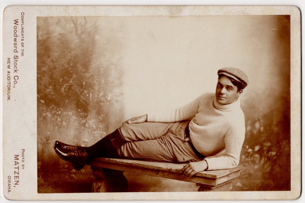 This is an original cabinet card photograph issued as a compliment of the Woodward Stock Company, New Auditorium, Omaha, Nebraska, and photographed by James Matzen of Omaha. The image features a young actor posed in a casual, reclining position across a wooden bench. He wears a light-colored ribbed turtleneck sweater, checked trousers, dark socks, laced boots, and a checkered flat cap. His gaze is directed confidently toward the camera, with a subtle, knowing smile that suggests both charm and theatrical poise. The relaxed pose contrasts with the formal studio background, giving the portrait a sense of personality and individuality. The photograph is well composed, with strong detail in the face and costume. His expression conveys ease and charisma—qualities likely intended to resonate with audiences of the Woodward Stock Company’s theatrical productions. The Woodward Stock Company was a leading theatrical troupe based in Omaha, Nebraska, during the late 19th and early 20th centuries. They performed at the New Auditorium, also known as the Omaha Auditorium, which opened in 1898 and became a center for local and traveling productions. The Woodward troupe featured a rotating cast of actors who appeared in a wide range of plays and dramas, and cabinet card portraits such as this were distributed as souvenirs and promotional pieces. The photographer, James Matzen, was a prominent Omaha studio photographer who produced cabinet cards and theatrical portraits. This cabinet card has light edge wear and age toning; back shows surface wear; and the image is clear with strong detail. (SOLD)