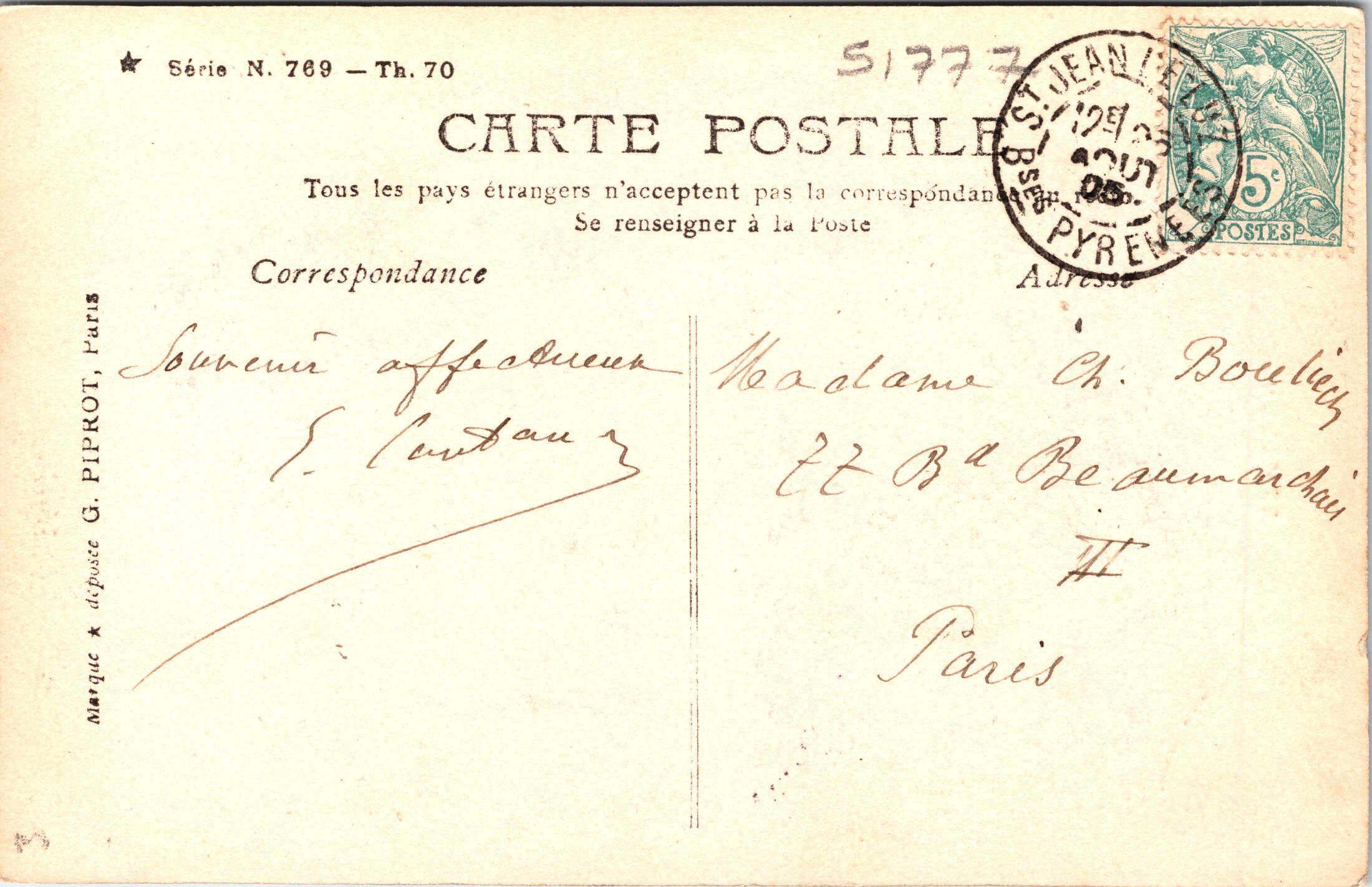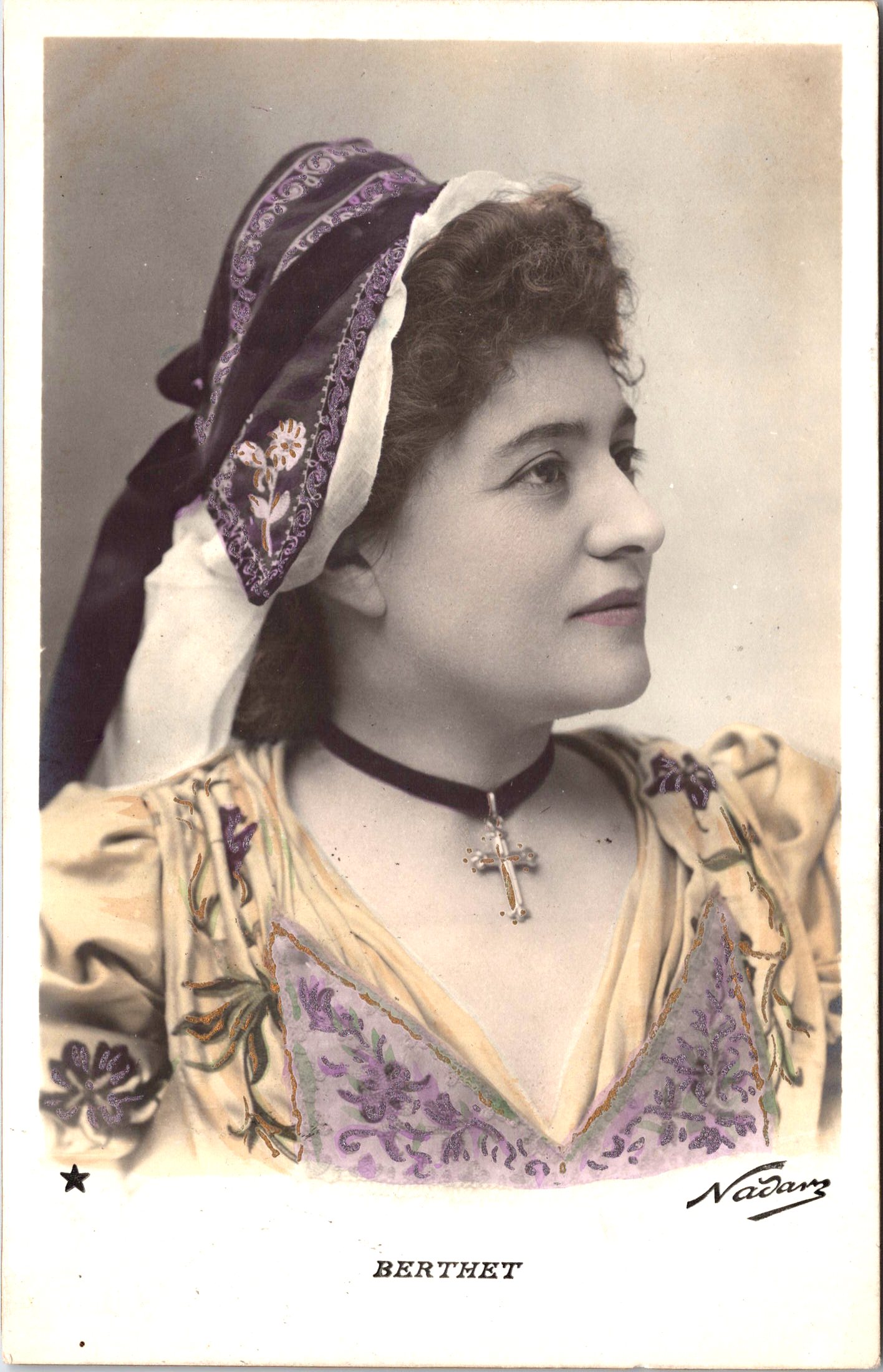 This exquisite early 20th-century hand‑tinted portrait postcard features the renowned Belgian‑born opera soprano Lucy Berthet (1866–1941), captured in profile by the eminent French studio Nadar. Gaspard‑Félix Tournachon, known as Nadar, was born 6 April 1820 and died 23 March 1910. His son, Paul Nadar (8 February 1856 – 1 September 1939), took over the studio. It’s believed this card is by Paul Nadar, as he is known to have photographed Lucy Berthet. Lucy trained at the Conservatoire de Paris , where she won the First Prize in opera singing in 1892. She debuted at the Paris Opera (Académie Nationale de Musique) in 1892 as Ophélie in Hamlet. She went on to perform major soprano roles: Juliette in Roméo et Juliette, Gilda in Rigoletto, Elsa in Lohengrin, Ortlinde in a French version of Die Walküre, Marguerite in Faust, Thaïs in Thaïs, and more through 1899. She was renowned as a long‑standing pensionnaire (resident artist) of the Paris Opera during the 1890s. This postcard features Lucy Berthet in a lavish embroidered costume, hand‑tinted with pastel purples and soft yellows, wearing a velvet choker with a jewel‑inset cross and matching headscarf. The publisher of this postcard was G. Piprot. He operated a studio in Paris. This card is part of a series (N. 769 – Th. 70). This postcard is in very good condition. It offers a crisp vignette with rich coloring. It has minor age toning and mild edge wear. The card was mailed in 1907 from St‑Jean‑de‑Luz (Basses‑Pyrénées, France) to Madame Ch. Boulliez in Paris. The postcard has a 5c green French stamp and a brief message, “Souvenir affectueux (affectionate remembrance),” The postcard is signed by E. Coutan,”. This card is part of the Belle Époque tradition of theatrical portrait postcards by top photographers. Paul Nadar frequently captured prominent performers—including Lucy Berthet. (SOLD)