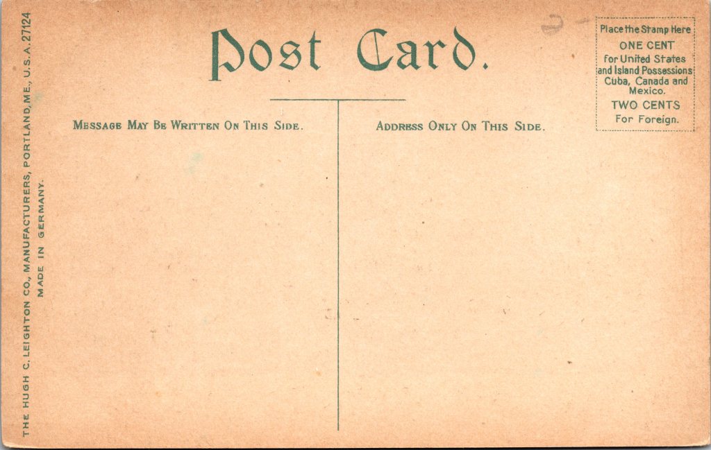 Postcard 1 is from circa 1909. It was published by the Hugh C. Leighton Company of Portland, Maine. The firm predominately published postcards of New England. They printed some cards in Maine but most, like this one, were manufactured in Frankfurt, Germany. In 1909, the firm merged with Valentine and Sons. (SOLD)