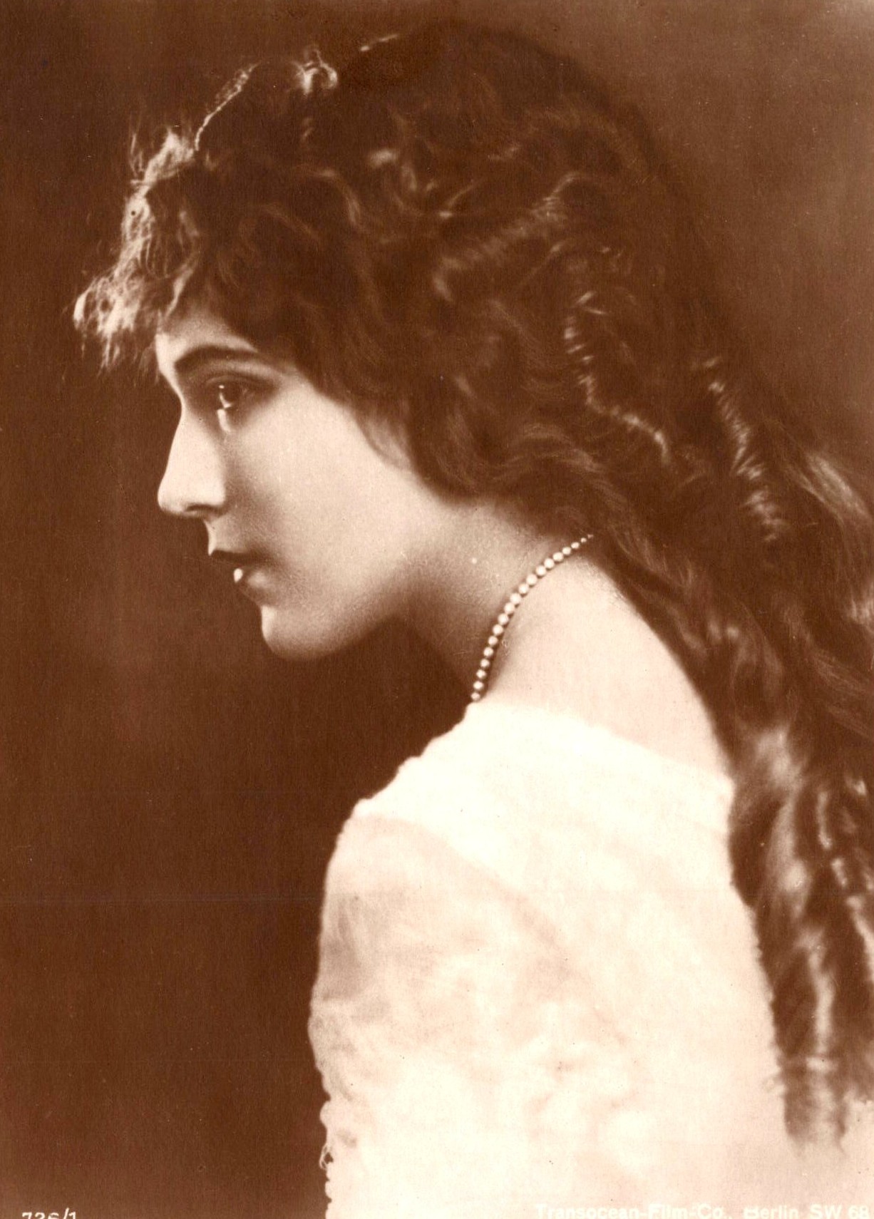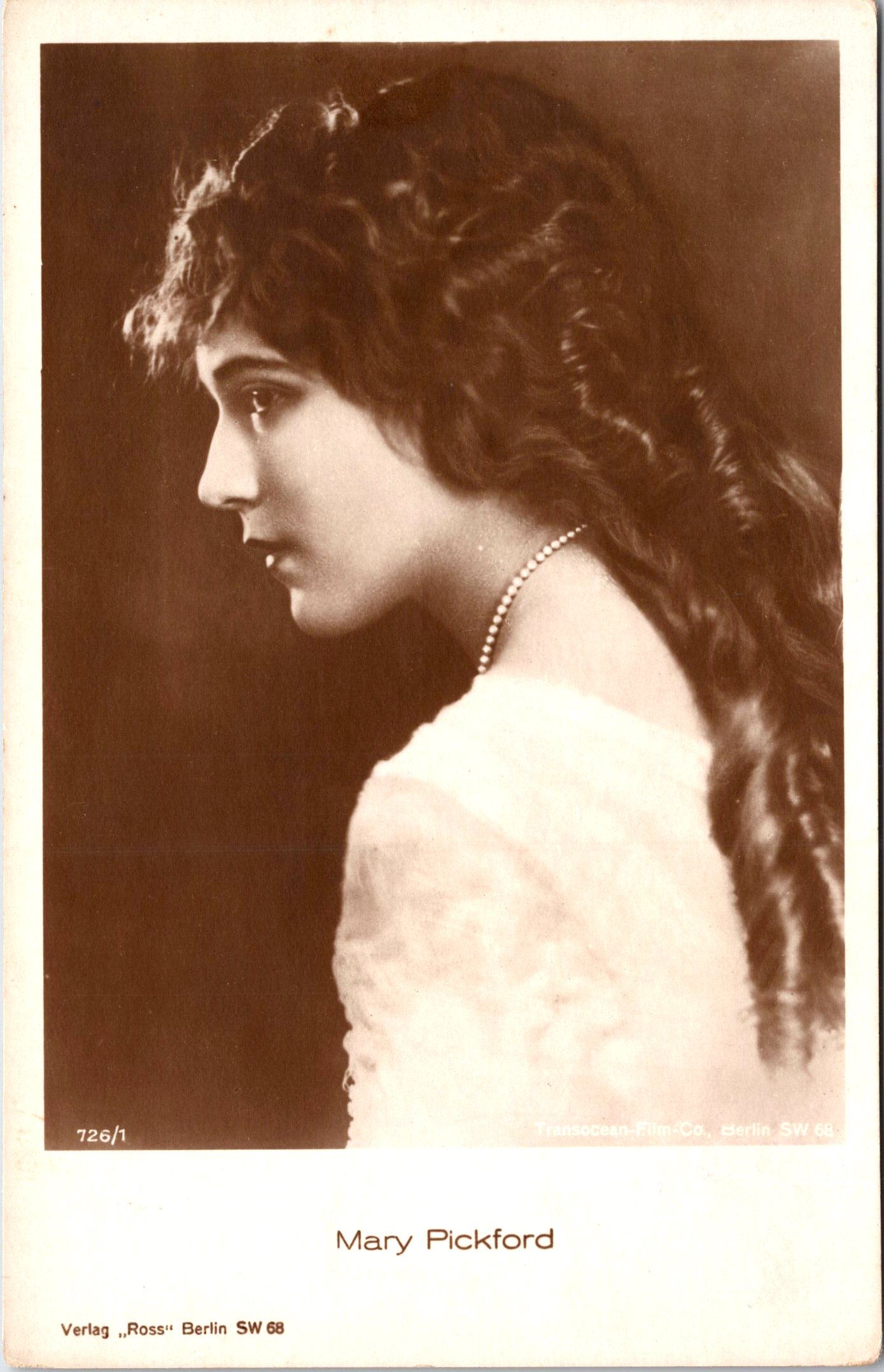 Mary Pickford (1892-1979) was a Canadian-American actress and one of the most influential figures in early Hollywood. She was often referred to as “America’s Sweetheart”. She was a pioneer of silent film and a co-founder of the film industry as we know it today. Pickford’s career began in childhood when she performed in theater productions in Canada and the United States. By the early 1900s, she transitioned to film, working with director D.W. Griffith at Biograph Studios. Her delicate beauty and expressive acting quickly made her a fan favorite, setting her apart in an era when exaggerated stage-style performances dominated silent films. During the 1910s and 1920s, Pickford became one of the highest-paid and most beloved actresses in the world. Starring in films such as Rebecca of Sunnybrook Farm (1917), Daddy-Long-Legs (1919), and Pollyanna (1920), she was known for playing wholesome, spirited young women. Her curly hair and signature on-screen innocence became iconic, but she was also a savvy businesswoman who understood the power of her brand. Pickford was not only a star but also a trailblazer in the film industry. In 1919, she co-founded United Artists alongside Charlie Chaplin, Douglas Fairbanks (her then-husband), and director D.W. Griffith. This revolutionary move allowed filmmakers to control their own productions rather than rely on major studios, changing the industry forever. As the film industry transitioned to “talkies,” Pickford retired from acting in the early 1930s, though she continued to produce films. Her contributions earned her an honorary Academy Award in 1976 for her lasting impact on cinema. Mary Pickford’s influence extends beyond her films. She helped shape the star system, paved the way for women in Hollywood, and co-founded the Motion Picture Relief Fund to support struggling actors. She remains an enduring symbol of early Hollywood glamour and innovation. Mary Pickford was born into a working-class family in Toronto, Canada. Her father, John Charles Smith, was an alcoholic who struggled to provide for the family and died from a workplace accident when Mary was just six years old. Her mother, Charlotte Hennessey Smith, was left to raise Mary and her two younger siblings, Lottie and Jack, on her own. To support the family, Charlotte encouraged her children to enter acting, and Mary began performing in theater at a young age. She soon became the family’s primary breadwinner, and her siblings, Lottie Pickford and Jack Pickford, also pursued film careers. Pickford transitioned from theater to film in the early 1900s, quickly rising to fame with her expressive acting and wholesome on-screen persona. By the 1910s and 1920s, she was one of the most recognizable stars in the world, earning the nickname “Queen of the Movies.” She also helped establish the Academy of Motion Picture Arts and Sciences. Mary Pickford was married three times. Pickford’s first marriage was to silent film actor Owen Moore (1911-1920). Her second and most famous marriage was to fellow silent film actor, Douglas Fairbanks (1920-1936). Her third marriage was to actor Charles “Buddy” Rogers (1937-1979). After retiring from acting in the early 1930s, Pickford focused on producing films and philanthropy. She became more reclusive in her later years, struggling with alcoholism and health issues. Today, she is remembered as a pioneering force in cinema history. This is a classic profile portrait of Mary Pickford, photographed in a soft-focus, romantic style that emphasizes elegance rather than celebrity bravura. She is shown in left-facing profile, her gaze cast downward, which lends the image a quiet, introspective quality typical of late 1910s–early 1920s studio portraiture. Her hair is worn long and loosely waved, flowing down her back in a natural cascade — a visual hallmark of Pickford’s screen persona during her peak years. The lighting is gentle and diffuse, carefully modeling her features without harsh shadows, while the dark background isolates her silhouette and heightens the sculptural effect of the profile. She wears a light-colored gown with a soft neckline and a single-strand pearl necklace, reinforcing the refined, feminine image that made her internationally recognizable. The overall effect is idealized and ethereal, very much in keeping with publicity imagery intended for the European market. The postcard was issued by Verlag “Ross,” Berlin, with distribution credited to Transocean-Film Co., Berlin, indicating a German publisher producing authorized star portraits for international film audiences during the silent era. (SOLD)
