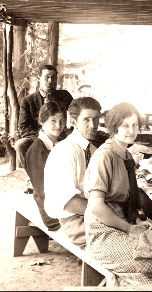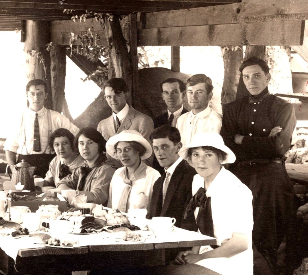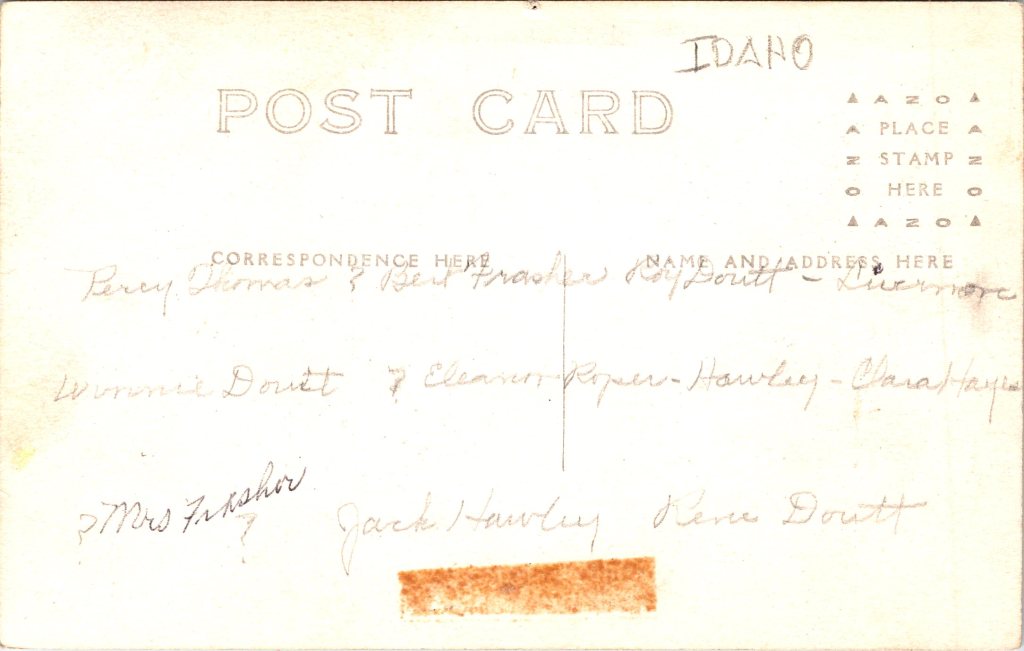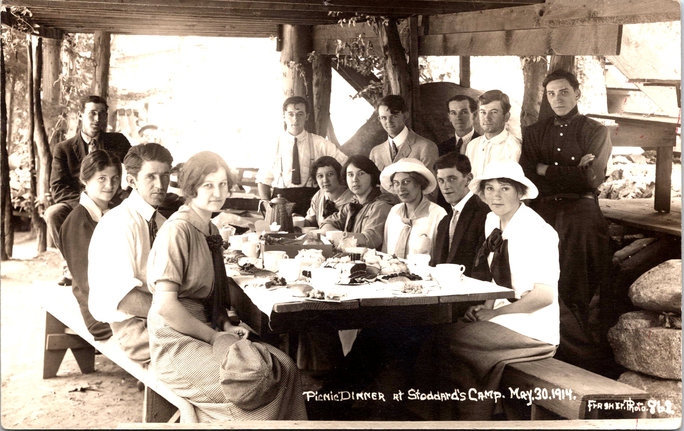 This engaging real photo postcard captures a large picnic gathering posed around a long wooden table. The scene is identified in caption as a “Picnic Dinner at Stoddard’s Camp, May 30, 1914.” The scene appears to be set beneath a rustic open-sided shelter, likely part of a campground or excursion destination, with heavy timber beams overhead and large rocks visible in the background—details that strongly evoke an early 20th-century recreational camp environment. Seated and standing around the table are fourteen young adults, men and women, most appearing to be in their late teens to early thirties. The men wear period-appropriate shirts, ties, and jackets—some with suspenders—while the women are dressed in modest blouses and long skirts, several accessorized with wide-brimmed hats typical of the 1910s. Their expressions range from relaxed to quietly formal, suggesting the photographer asked the group to pause mid-meal. The table is covered with cups, plates, and food, reinforcing the sense of a communal outing rather than a staged studio portrait. The overall mood is social and intimate, offering a vivid snapshot of leisure culture just before World War I, when group picnics and organized outings were popular among young working adults and social clubs. The shelter structure and natural surroundings hint that this was a known destination rather than a private backyard. In the lower right corner of the image, the photographer credit appears to read “Frasher Photo” followed by a number (possibly “863”). This attribution is consistent with Frasher, a well-known western U.S. photographer active in the early 20th century, particularly in the Pacific Northwest and Intermountain West. Burton Frasher (1888 –1955) was an influential American photographer and publisher best known for his extensive documentation of the landscapes, towns, and daily life of the American West in the first half of the 20th century. Frasher began his career in photography in 1914 when he established a studio in Lordsburg(now La Verne) California. By 1921, he relocated the studio to Pomona, California, where Frasher shifted his focus toward producing and publishing real photo postcards. These postcards—marketed as “Frasher Fotos”—quickly became popular, capturing scenic vistas, historic towns, and the evolving infrastructure of the West. His work spanned California, Arizona, New Mexico, Colorado, Utah, Nevada, Oregon, Washington, Alaska, and parts of Mexico. The reverse of the postcard is clearly marked “IDAHO” in pencil. There was a Stoddard’s Camp in Idaho, believed to have been a recreational campground (likely in northern Idaho), making Idaho a plausible—though not absolutely confirmed—location for this image. There were campgrounds in other states that had “Stoddard” in their names. In addition, if Frasher took the photo on this card, it had to be very early in his career since the photo was taken in his first year of business. The question remains, was there another photographer, sharing the Frasher name who operated the same time as Burton Frasher. It is strange though that both photographer labeled their postcards, “Frasher Photos’. In regard to condition, the image side is in good vintage condition, with strong tonal contrast and clear facial detail. There is a very difficult to detect pin hole at the top center of the postcard. It is more detectable on the reverse of the card. Notably, there is a patch of tape residue at the bottom center of the reverse, which does not affect the image side. Overall, the card presents well and remains an excellent social-history photograph from the 1910s (see scans).