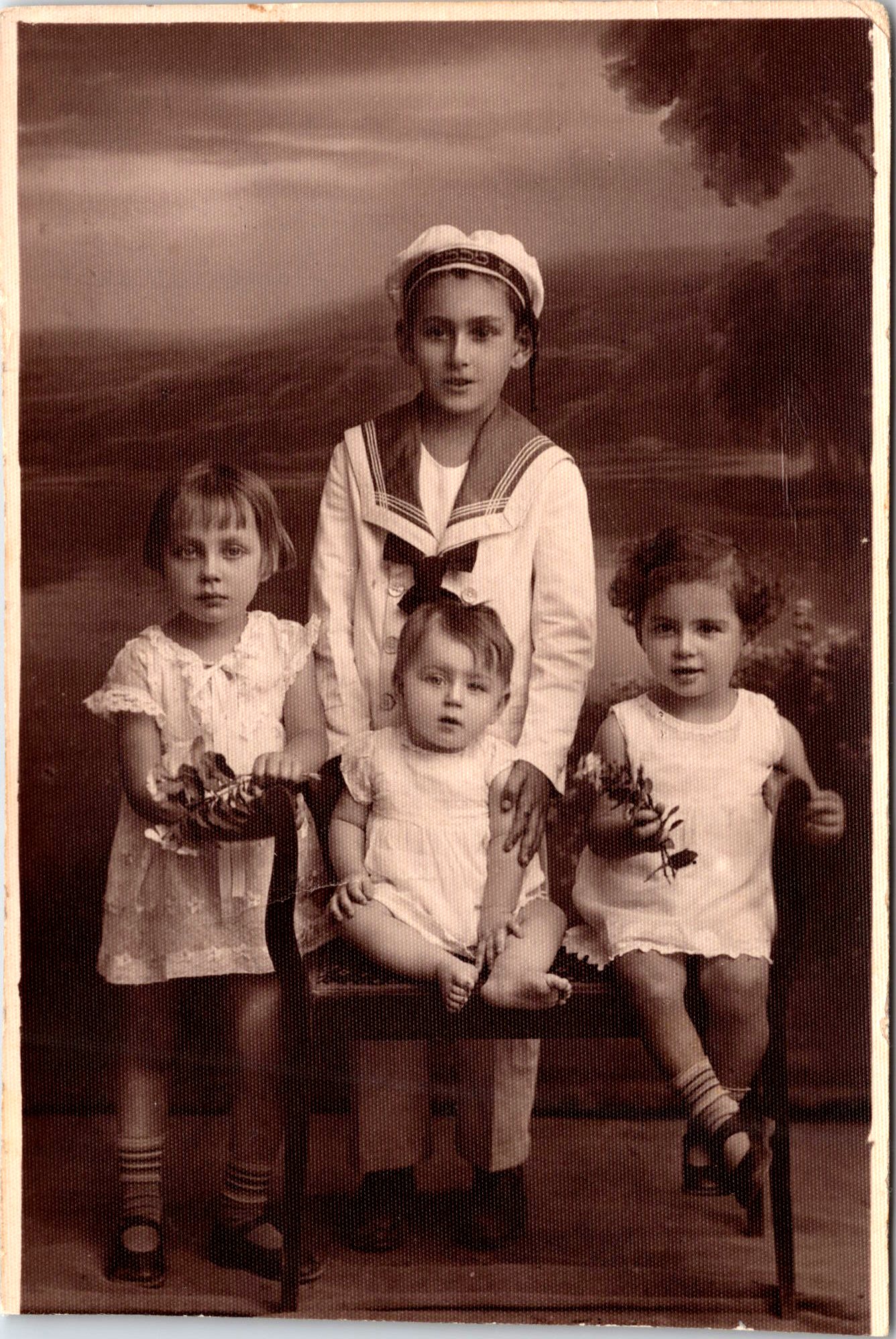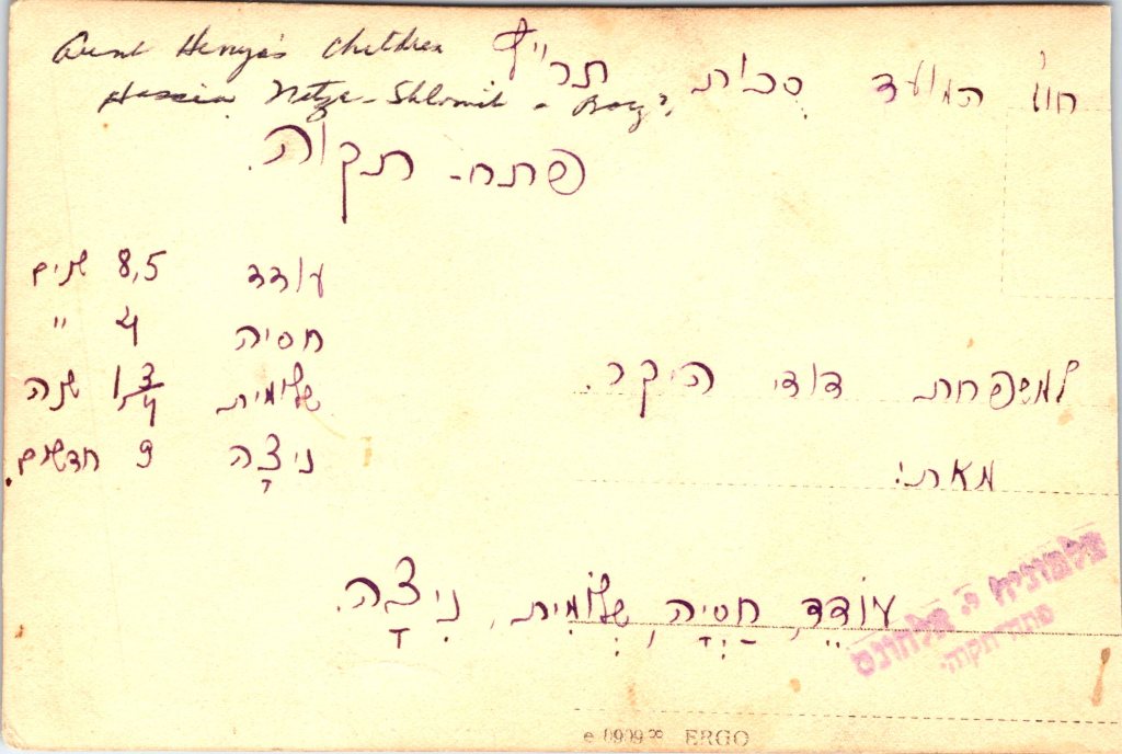 This evocative early 20th-century lithographic photograph depicts four children, likely siblings, posed together in a domestic or courtyard setting. The composition is striking for the contrast in age: one older child, standing or seated protectively behind or beside three much younger children, who appear to range from toddler to early childhood. The older child’s posture and expression suggest responsibility and attentiveness, reinforcing the impression of familial hierarchy and care. The children are dressed in simple but carefully chosen clothing typical of the pre-World War I or interwar Jewish diaspora, with modest garments that reflect everyday life rather than studio formality. Their expressions are sober and composed, a common feature of period photography, particularly within Eastern European or immigrant Jewish communities where photographs were often made to commemorate family continuity or to be sent to relatives abroad. Turning to the reverse, the photograph bears handwritten Hebrew text, written in a flowing but economical hand. The inscription appears to be a personal dedication, likely identifying the children or addressing a family member. In narrative translation, the text conveys a sense of familial connection and remembrance rather than a commercial or studio notation, suggesting the photograph was intended as a keepsake rather than a public portrait. Taken together, the image and inscription strongly suggest a Jewish family context, possibly Eastern European or immigrant, dating to approximately the 1910s–1920s. Photographs of this type are historically significant, as they document ordinary Jewish family life during a period marked by migration, instability, and profound cultural transition. The following is an AI translation of the text on the reverse of the photo. The reverse of the photograph bears handwritten Hebrew identifying the children by name and age. Three girls—Chava, Rachel, and Sarah—are listed, along with a fourth child, a baby boy noted as nine months old. The ages are carefully recorded: one child aged eight and a half, another four years, a toddler of one and three-quarters years, and an infant. The place name Petach Tikva is prominently written, situating the family in what was then a Jewish settlement in Mandatory Palestine. The inscription reads as a personal family record rather than a postcard message, likely intended to document and preserve the identities of the children. A brief closing—“From me!”—suggests the photograph was sent as a keepsake to relatives. An English annotation at the top, reading “Aunt Henny’s Children”, appears to have been added later, reinforcing the photograph’s role as a family archive object rather than a commercial image. This photo measures about 3.25 x 5 inches. The photograph presents well overall. The photograph is possibly trimmed at it’s bottom. The image has a crease which can be seen on the seated middle child’s right hand. The handwritten Hebrew inscription on the reverse remains legible and intact (see scans).