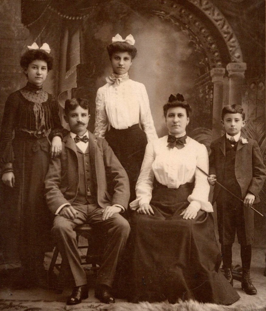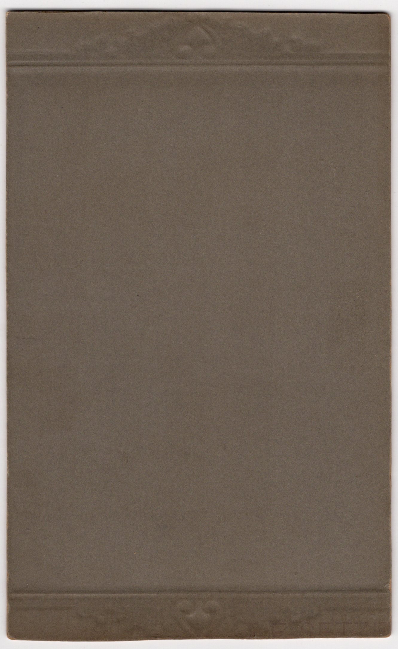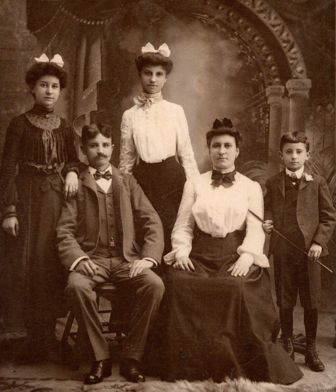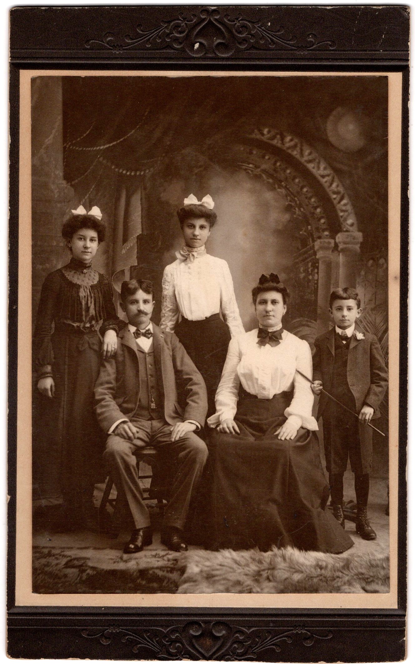 This handsome late nineteenth-century cabinet card presents a formal studio portrait of a family group, likely parents with their three children, posed against an elaborately painted architectural backdrop featuring arches, columns, and draped elements. The composition is carefully balanced, with the seated adults at center and the children arranged standing and seated around them, a conventional and deliberate arrangement that emphasized family unity and social stability during the Victorian era. The father is seated at left, wearing a tailored three-piece suit with vest, bow tie, and neatly groomed mustache, while the mother sits beside him in a high-necked blouse and long skirt, holding a slender object that may be a parasol or riding crop—an accessory sometimes used to lend formality or composure to studio portraits. The children are dressed in refined, period-appropriate clothing: the girls wear high-collared dresses with decorative bows in their hair, and the boy at right appears in a suit with knee-length trousers, stockings, and lace-up boots, suggesting a late Victorian to very early Edwardian date. Their expressions are composed and serious, typical of the era’s long exposure times and social expectations of photographic portraiture. The photograph was almost certainly taken in a professional studio, rather than in a private home, as indicated by the theatrical painted backdrop and controlled lighting. While no studio imprint is visible on the card itself, the style of backdrop, clothing, and posing strongly suggests a North American or Western European studio, most likely in the United States or Canada, where such cabinet cards were extremely popular. Without a photographer’s mark, the exact location cannot be determined, but the aesthetic aligns closely with American studio work of the 1890s. The cabinet card measures approximately 4¼ by 6 1/4 inches, which is slightly taller than the most common standard cabinet card size. This dimension places it very close to what collectors often refer to as a boudoir-format cabinet card or a transitional oversized cabinet, a format that gained popularity in the late 1880s and 1890s for larger, more impressive family portraits intended for parlor display. While not a full boudoir card (which are typically larger still), the proportions suggest a deluxe presentation rather than a basic cabinet card. Based on clothing styles, hair arrangements, and the studio setting, this photograph was most likely taken circa 1890 to 1898. The high collars, structured bodices, and tailored men’s wear firmly anchor it in the late Victorian period, just before Edwardian fashions began to soften silhouettes and lower necklines. The photo’s condition is very good overall for a cabinet card of this age. The image remains clear with good tonal range and fine detail, especially in facial features and clothing textures. There is light, even age toning, along with minor edge and corner wear to the mount. The mount shows some gentle surface wear but remains structurally sound, with no creases or losses. Overall, the card presents attractively.