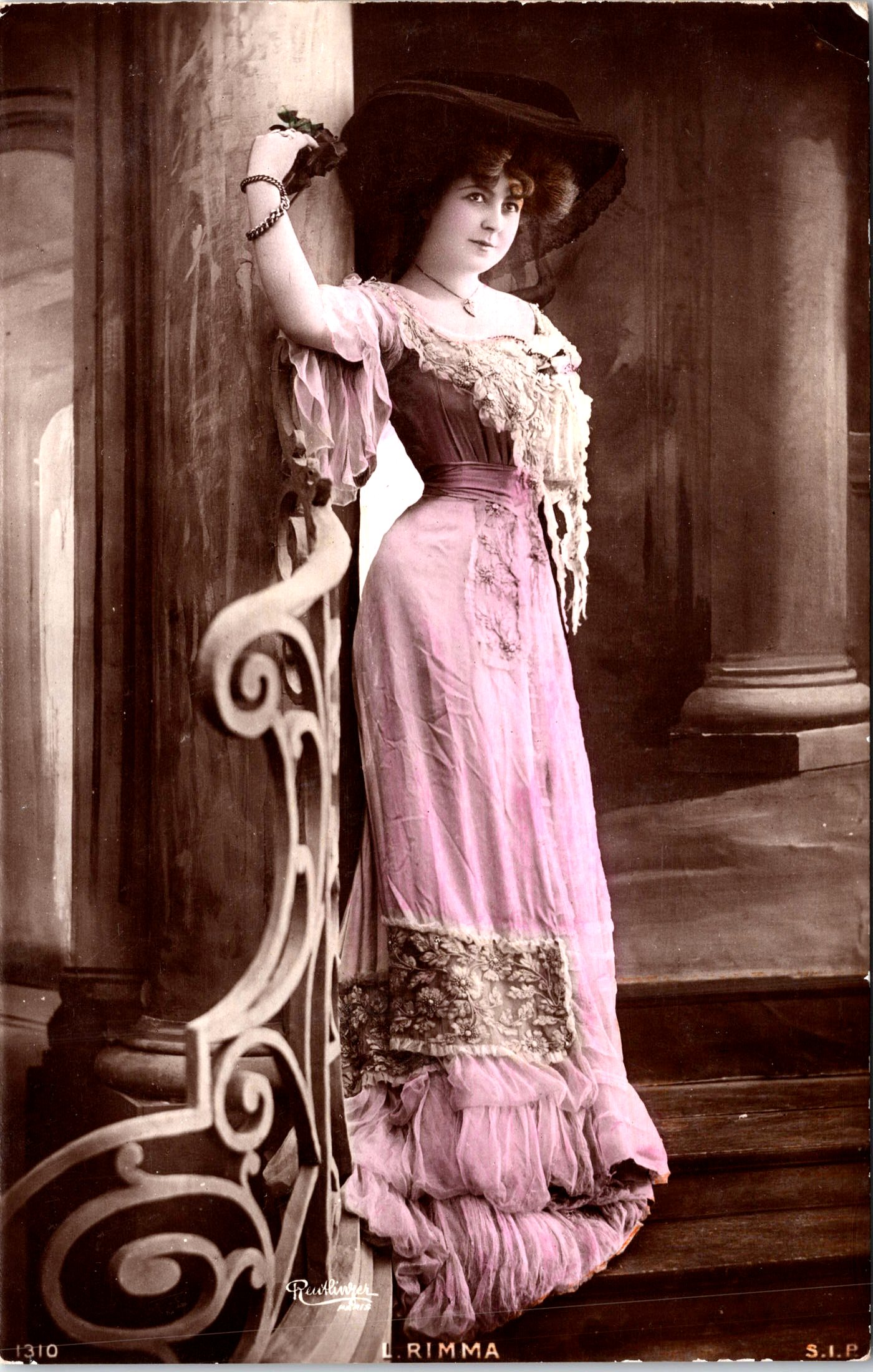 Offered here is a striking early 20th-century French theatrical postcard featuring the actress Lily Rimma, photographed in an elegant studio pose by the celebrated Paris photographer Reutlinger. This is a beautifully composed full-length portrait, showing the performer leaning against an ornate balustrade, framed by classical architectural columns—an image clearly intended to convey refinement, poise, and stage presence. Rimma is dressed in a flowing Edwardian gown rendered in delicate hand-applied pink coloration, with lace detailing, ribbon accents, and a richly patterned hem. She wears a large, dramatic hat with veil, a bracelet, and a pendant necklace, all contributing to the unmistakable theatrical glamour of the period. Her relaxed yet confident pose and direct gaze reflect the visual language commonly used for actresses and singers in Paris at the height of the Belle Époque. The postcard bears the Reutlinger, Paris studio credit in the image. It was issued by S.I.P. (Société Industrielle de Photographie), a well-known French publisher responsible for many high-quality performer postcards of this era. The postcard is part of a series (No.1310). The divided back postcard is consistent with circa 1903–1905 production. This is a fine example of a hand-colored theatrical postcard, combining high photographic quality with subtle color work. SOLD