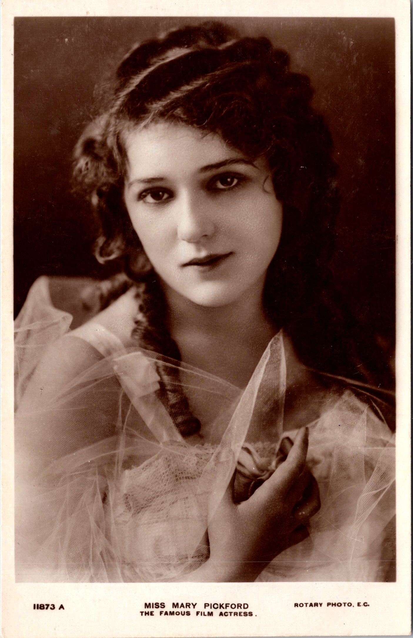 Mary Pickford (1892-1979) was a Canadian-American actress and one of the most influential figures in early Hollywood. She was often referred to as “America’s Sweetheart”. She was a pioneer of silent film and a co-founder of the film industry as we know it today. Pickford’s career began in childhood when she performed in theater productions in Canada and the United States. By the early 1900s, she transitioned to film, working with director D.W. Griffith at Biograph Studios. Her delicate beauty and expressive acting quickly made her a fan favorite, setting her apart in an era when exaggerated stage-style performances dominated silent films. During the 1910s and 1920s, Pickford became one of the highest-paid and most beloved actresses in the world. Starring in films such as Rebecca of Sunnybrook Farm (1917), Daddy-Long-Legs (1919), and Pollyanna (1920), she was known for playing wholesome, spirited young women. Her curly hair and signature on-screen innocence became iconic, but she was also a savvy businesswoman who understood the power of her brand. Pickford was not only a star but also a trailblazer in the film industry. In 1919, she co-founded United Artists alongside Charlie Chaplin, Douglas Fairbanks (her then-husband), and director D.W. Griffith. This revolutionary move allowed filmmakers to control their own productions rather than rely on major studios, changing the industry forever. As the film industry transitioned to “talkies,” Pickford retired from acting in the early 1930s, though she continued to produce films. Her contributions earned her an honorary Academy Award in 1976 for her lasting impact on cinema. Mary Pickford’s influence extends beyond her films. She helped shape the star system, paved the way for women in Hollywood, and co-founded the Motion Picture Relief Fund to support struggling actors. She remains an enduring symbol of early Hollywood glamour and innovation. Mary Pickford was born into a working-class family in Toronto, Canada. Her father, John Charles Smith, was an alcoholic who struggled to provide for the family and died from a workplace accident when Mary was just six years old. Her mother, Charlotte Hennessey Smith, was left to raise Mary and her two younger siblings, Lottie and Jack, on her own. To support the family, Charlotte encouraged her children to enter acting, and Mary began performing in theater at a young age. She soon became the family’s primary breadwinner, and her siblings, Lottie Pickford and Jack Pickford, also pursued film careers. Pickford transitioned from theater to film in the early 1900s, quickly rising to fame with her expressive acting and wholesome on-screen persona. By the 1910s and 1920s, she was one of the most recognizable stars in the world, earning the nickname “Queen of the Movies.” She also helped establish the Academy of Motion Picture Arts and Sciences. Mary Pickford was married three times. Pickford’s first marriage was to silent film actor Owen Moore (1911-1920). Her second and most famous marriage was to fellow silent film actor, Douglas Fairbanks (1920-1936). Her third marriage was to actor Charles “Buddy” Rogers (1937-1979). After retiring from acting in the early 1930s, Pickford focused on producing films and philanthropy. She became more reclusive in her later years, struggling with alcoholism and health issues. Today, she is remembered as a pioneering force in cinema history. This vintage early 20th-century real photograph postcard depicting Mary Pickford, was issued by Rotary Photo, E.C., and bears the serial number 11873A. Rotary Photo was a major British publisher of celebrity and theatrical postcards, known for producing high-quality real photograph cards from studio portraits of prominent stage and film performers. The image presents Pickford in a soft, intimate studio portrait, shown from the shoulders up, wearing a sheer, gauzy costume that frames her face and neckline. Her hair is styled in loose curls, arranged simply rather than theatrically, reinforcing the youthful quality of the image. Her expression is calm and introspective, with a direct, slightly wistful gaze that emphasizes her delicacy and screen presence. In this portrait, Pickford appears quite young, consistent with her image during the late 1910s, when she was already famous but still closely associated with youthful roles. This exact portrait is held by the National Portrait Gallery, London, which dates the photograph to circa 1918, providing a solid institutional reference point for dating. The card was printed in Britain and is clearly identified on the reverse as a real photograph. The postcard is in very good antique condition overall. The image retains strong tonal quality with good clarity and contrast. Corners only show light wear and there are no creases, tears, or losses. The reverse is clean. Overall, the card presents very well and remains highly displayable {See Scans).