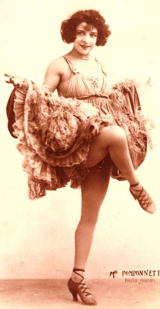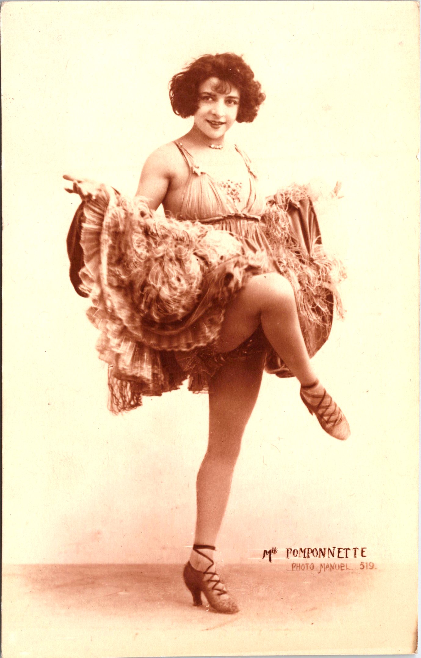 This engaging early 20th-century theatrical postcard features Mlle. Pomponnette, a young stage dancer captured mid-movement, holding her skirt in a lively, playful pose. The image reflects the popular style of music hall, café-concert, and revue performers who flourished in France and across Europe during the postcard boom of the Belle Époque. Pomponnette’s costume—light, decorative, and designed to emphasize motion—suggests a performer known more for charm and personality than for formal ballet. Such poses were typical of dancers who appeared in popular entertainment venues rather than classical theaters, and postcards like this served as inexpensive celebrity images, eagerly collected by admirers. The name “Pomponnette” is almost certainly a stage name, a common practice among dancers of the period. These whimsical or diminutive names were chosen for memorability and marketing appeal, particularly when images were widely distributed as postcards. Basically, “Pomponnette” was a generic name used by a number of performers. Roughly translated, the word means “dainty tassel or ornament”. The word could be interchanged with “flapper”, “chorus girl”, or “show girl”. This postcard dates to the golden age of performer postcards, when images of singers, dancers, and actresses were among the most sought-after subjects by collectors and the general public alike. Based on the postcard format, image style, and overall presentation, this card dates to circa 1900–1907, during the Undivided Back era, when the entire reverse side was reserved for the address and messages were written on the front or image side. This postcard is in overall very good vintage condition. There is light corner wear consistent with age. The image remains sharp with good tonal contrast There are no creases, tears, or losses (see scans).