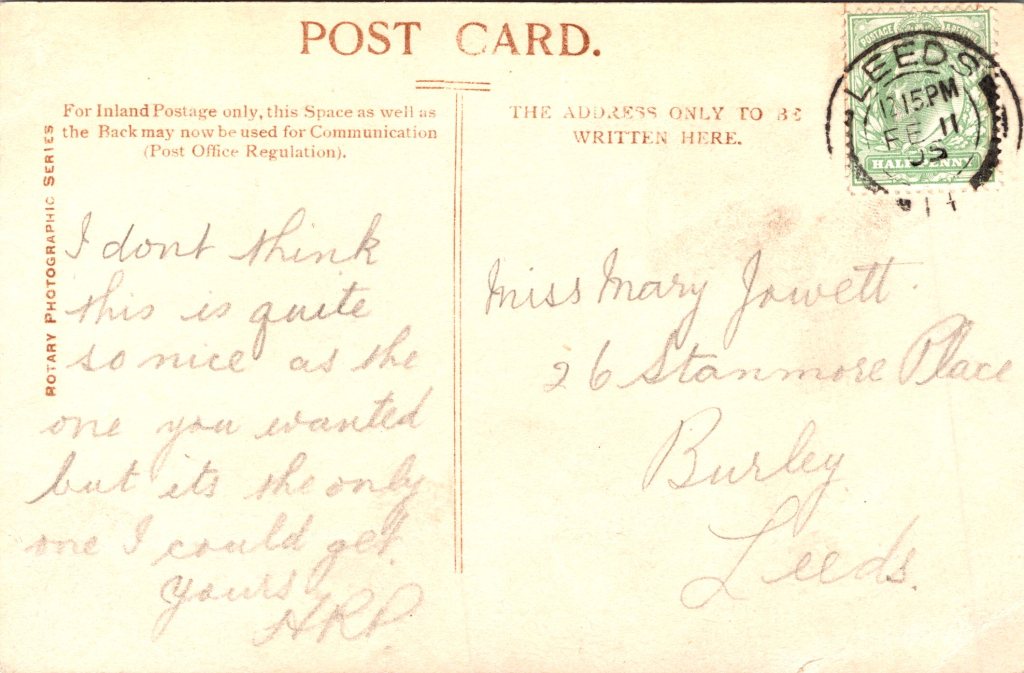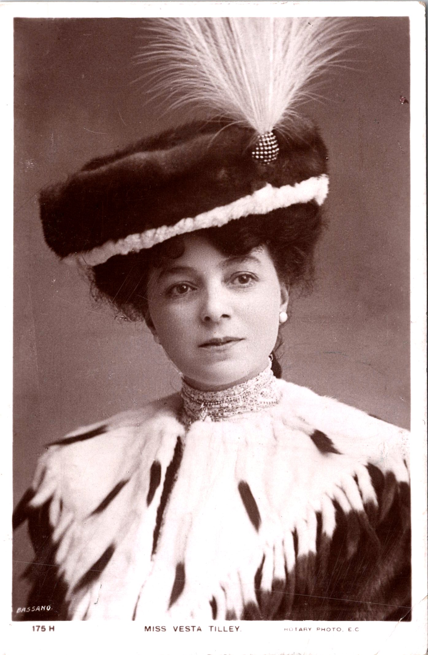 Vesta Tilly (1858-1952) was one of the most beloved and influential performers of the British music hall era. She was a groundbreaking male impersonator who captivated audiences for decades with her wit, charm, and powerful stage presence. Born into modest beginnings, she rose to become a symbol of British patriotism and a pioneer for women on the stage. Tilly was born in Worcester, England. She was the second of thirteen children born to Henry Powles, a self-employed musician and fiddler, and Matilda Powles. Her father, deeply involved in local musical performances, recognized Matilda’s precocious talent at an early age and began showcasing her on stage by the time she was just three years old. The Powles family moved to London when Matilda was a child, in pursuit of more lucrative theatrical opportunities. With her father acting as her manager, she began performing under the stage name “Little Tilly” in pantomimes and variety shows. Matilda’s first male impersonation was at the tender age of six. By her teenage years, she had taken the stage name Vesta Tilly, inspired by the Roman goddess of the hearth (Vesta) and a common nickname (Tilly). Her success as a “principal boy” in pantomime was soon eclipsed by her signature act: portraying men with startling authenticity and satirical flair. What set Tilly apart was her command of the stage and her uncanny ability to adopt male gestures, mannerisms, and vocal inflections. She didn’t just mimic men—she portrayed them with intelligence, humor, and often, social critique. She frequently played dapper young men, military officers, or swells (wealthy young men), sometimes poking fun at political figures or addressing social issues. She became one of the most highly paid and respected performers in the British music hall scene during the late Victorian and Edwardian periods. Her stage appearances were so convincing that many audience members did not initially realize she was a woman. Vesta Tilly’s career spanned over four decades, and she performed in countless popular songs and sketches. Some of her most iconic performances included: “Following in Father’s Footsteps”, “Burlington Berlie”, and “The Boy in the Gallery”. She was particularly popular among working-class audiences and soldiers. During World War I, Tilly took on a new patriotic role, performing in uniform to recruit young men to the military. She was so effective that she earned the nickname “England’s Greatest Recruiting Sergeant.” In 1890, Vesta Tilly married Walter de Frece, a theatrical impresario and songwriter. Their relationship was both romantic and professional—Walter became her manager and guided much of her career. He was instrumental in helping shape her brand and ensuring her continued success on the music hall circuit. After World War I, Walter was knighted and later became a Member of Parliament. This new political role brought Vesta into a more socially prominent world, and she gradually withdrew from the stage. Vesta Tilly gave her final performance in 1920 at the London Coliseum. Her retirement was widely publicized and emotional for her devoted fan base. After stepping away from the stage, she became Lady de Frece, supporting her husband’s political ambitions and engaging in charity work. The couple eventually moved to Monte Carlo, where they lived a quieter life. Walter de Frece died in 1935, and Vesta lived on until 1952. This postcard portrait was produced by the renowned London photographic studio Bassano, whose work is closely associated with royalty, theatrical stars, and prominent public figures. Tilley is shown in an elegant studio portrait wearing a dramatic fur-trimmed costume and an elaborate feathered hat, projecting the poise and refinement that made her a major stage attraction. Although best remembered for her celebrated male-impersonation roles, this image presents her in a formal, feminine guise, offering a compelling contrast that enhances its appeal to collectors. The postcard was published by Rotary Photo. The card was postmarked in 1905 and is in the early divided back format. The message on the postcard is apologetic. It states in part “I don’t think this is quite so nice as the one you wanted but its the only one I could get.” In regard to condition, this is a strong image with soft contrast and good detail. There is a crease in the card’s lower right corner and mild corner wear. Overall, this 120 year old card is in good antique condition (see scans).